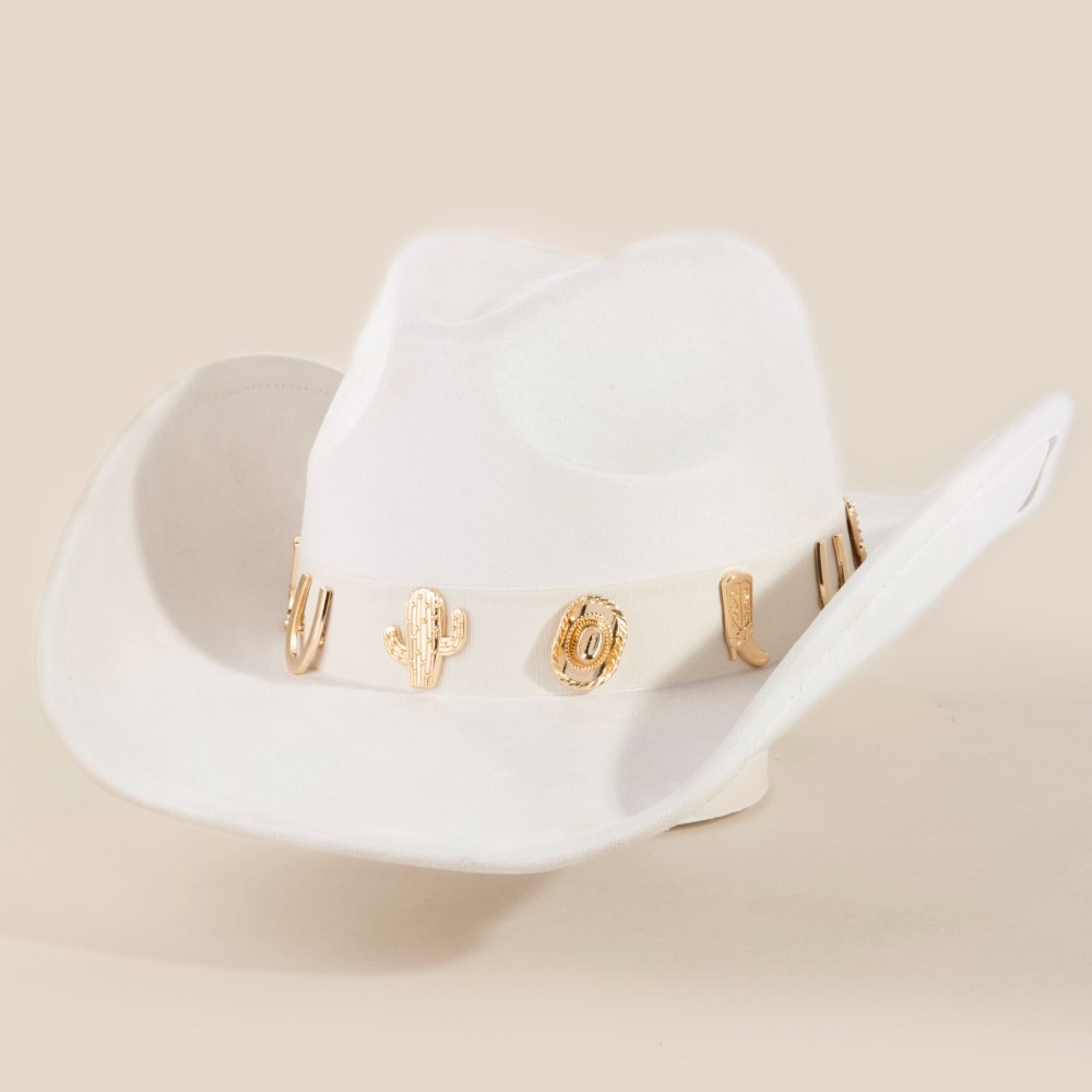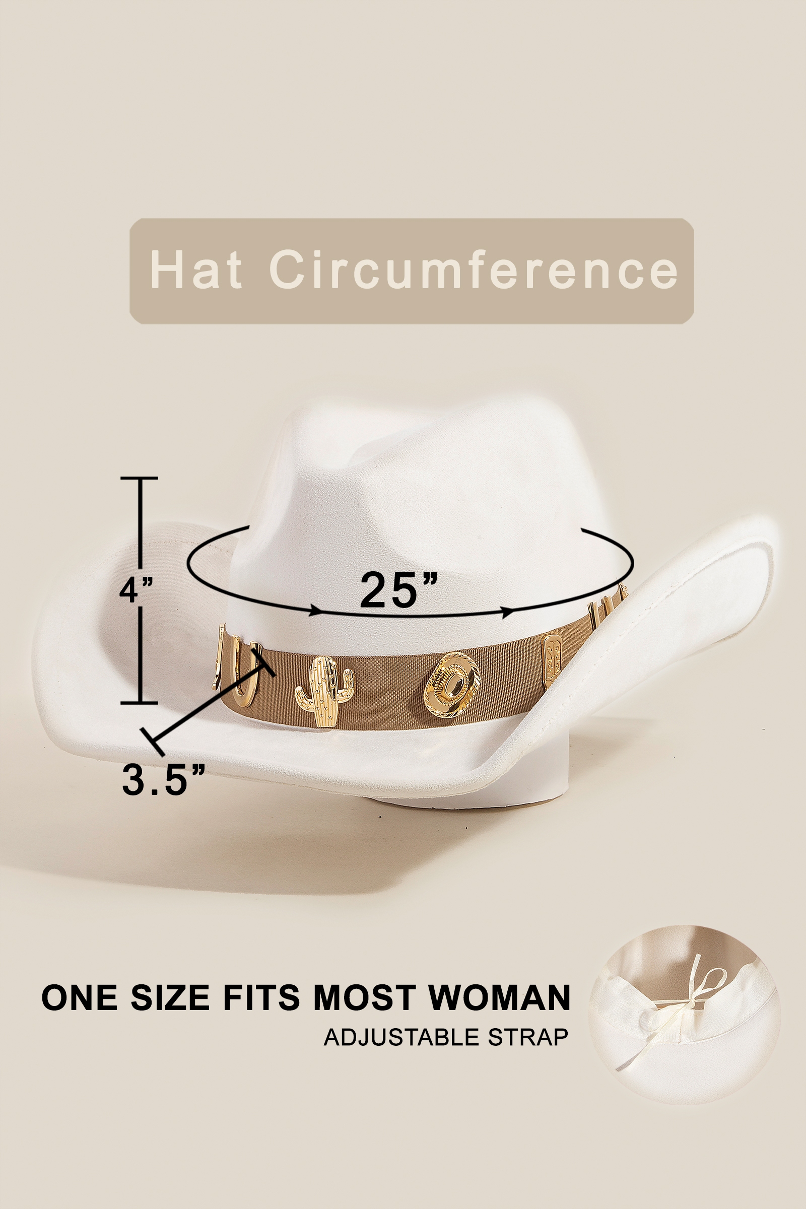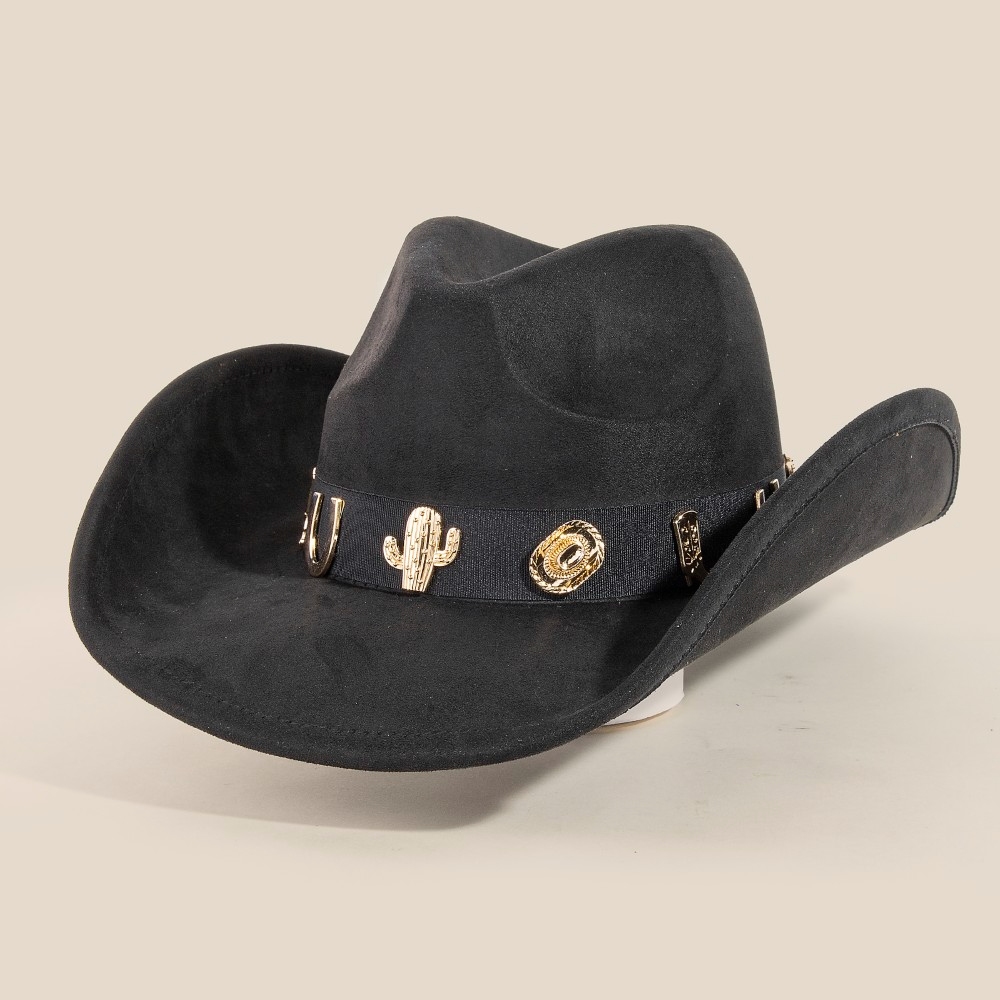 • Add a touch of luxury to any outfit, this cowboy hat incorporates a remarkable western cactus horseshoe boots decor design. Redefine your wardrobe with this versatile cowboy hat, a timeless addition that brings an air of sophistication to any look. Available in BK, BR and IV. This item is sold in packs of 1.