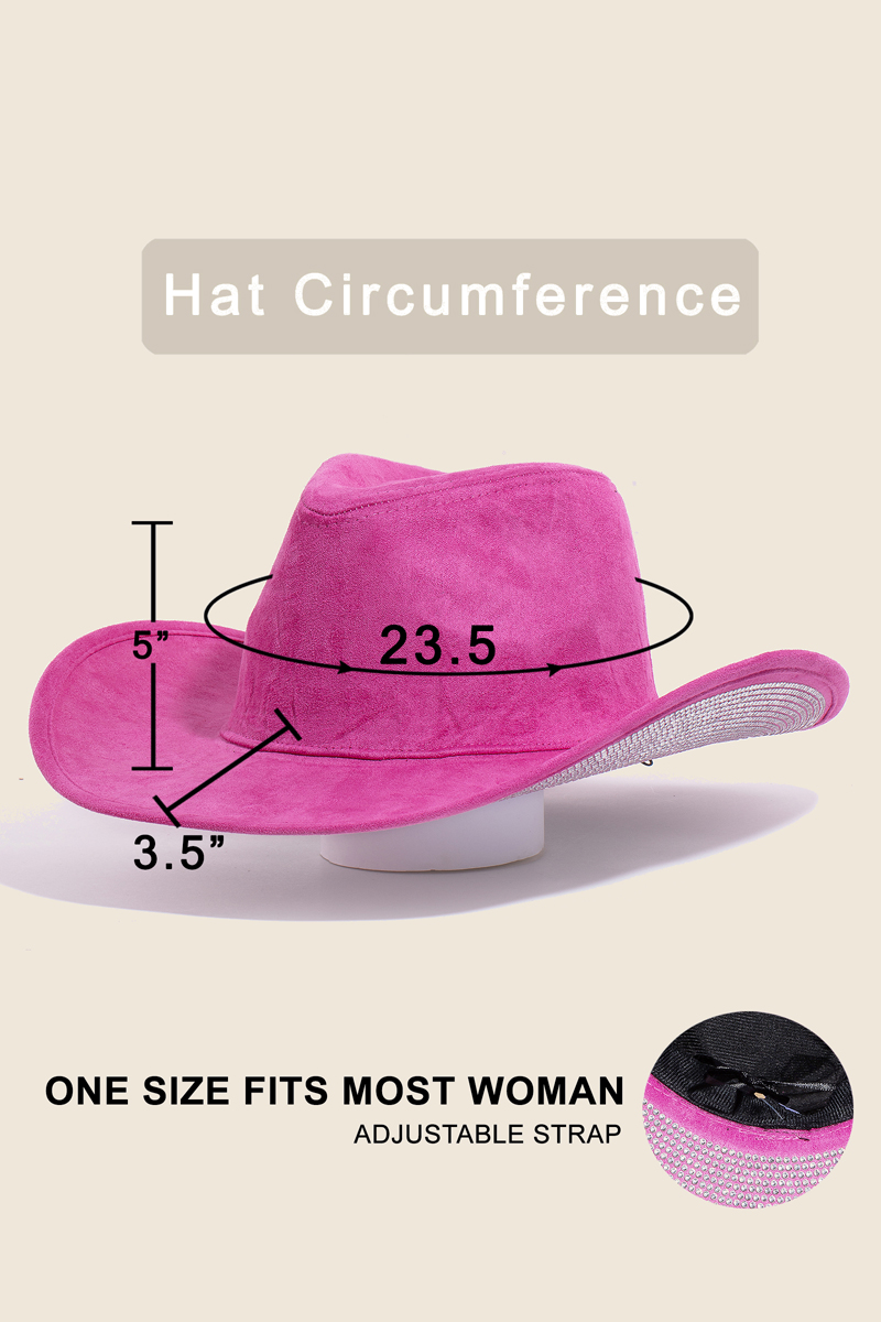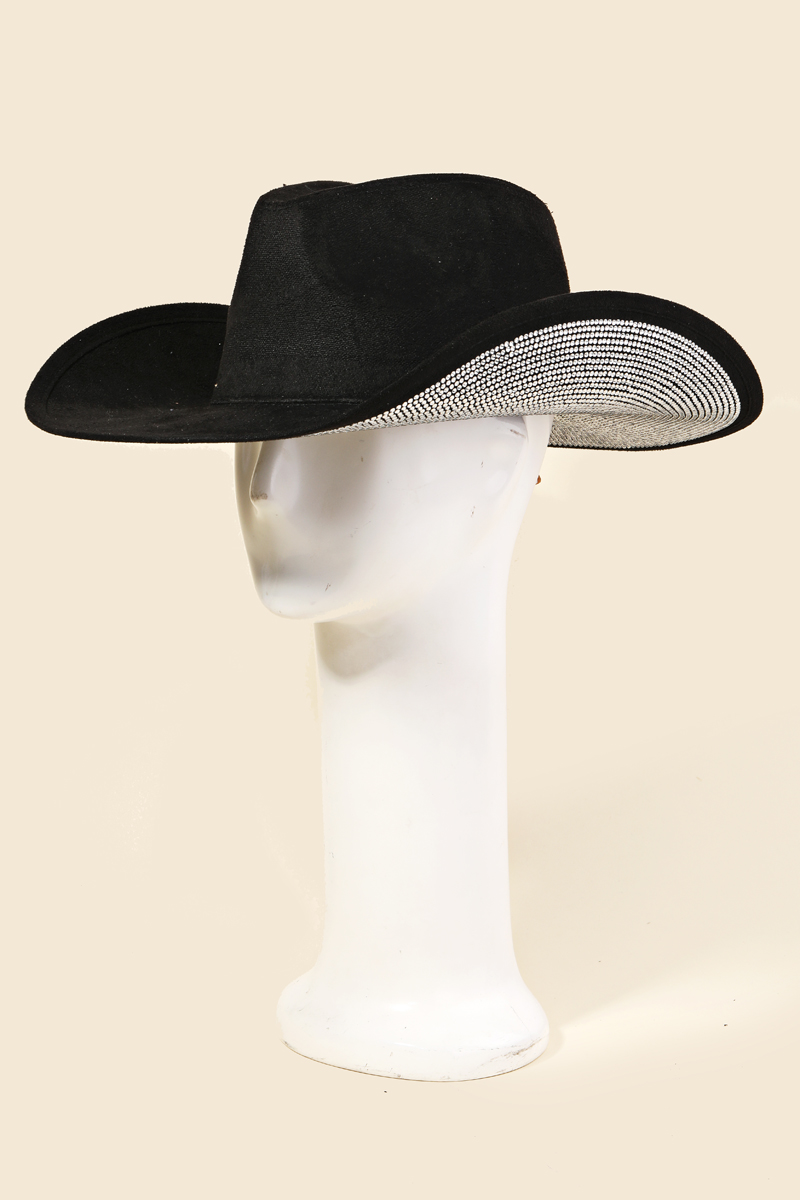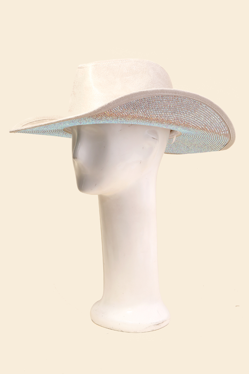 Elevate any look, this cowboy hat features a distinct studded rhinestone brim design. This cowboy hat is ideal for both casual and formal events, adding a touch of sophistication to any outfit. Available in AB, BK, FU, IV. This item is sold in packs of 1.