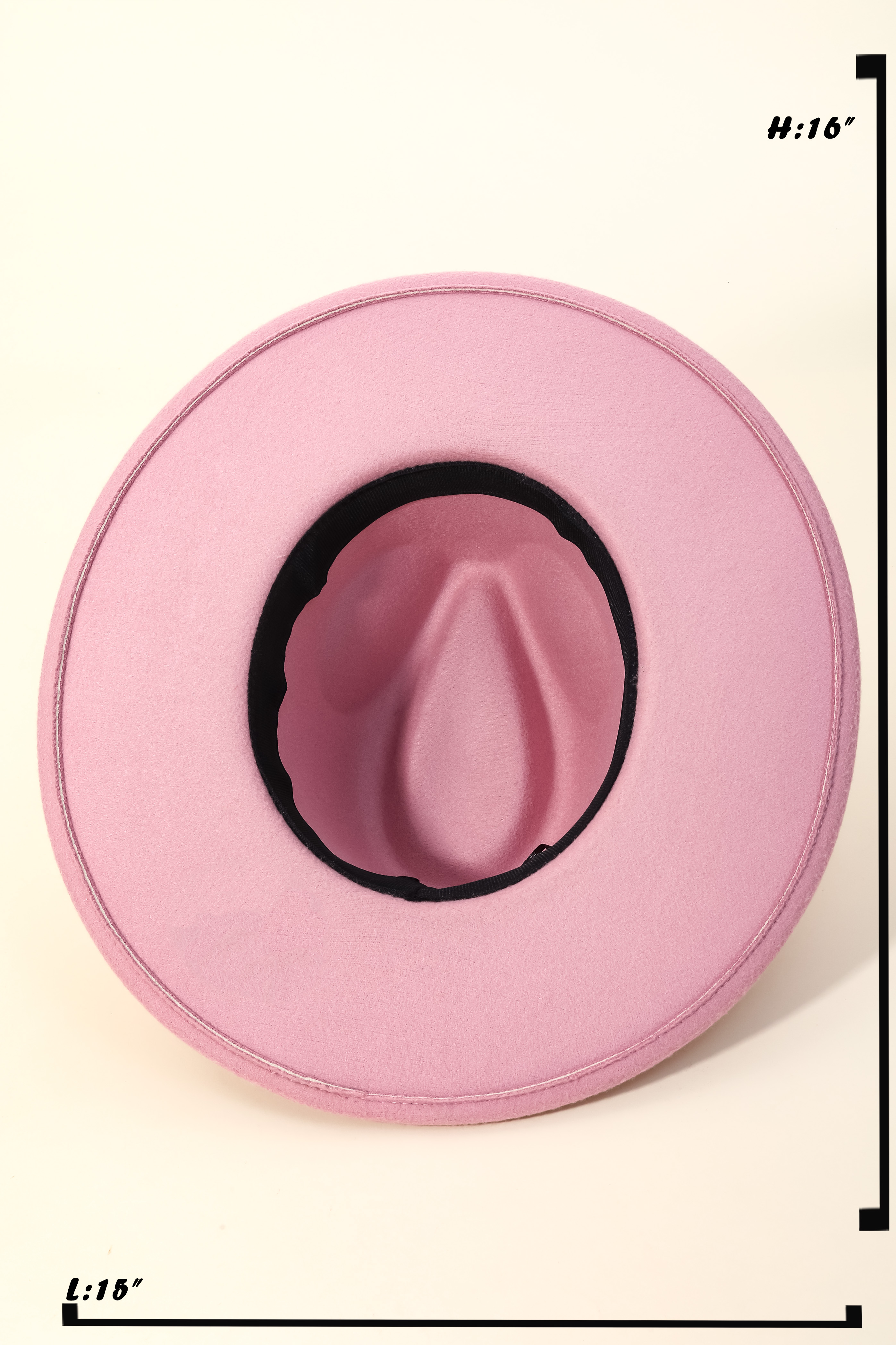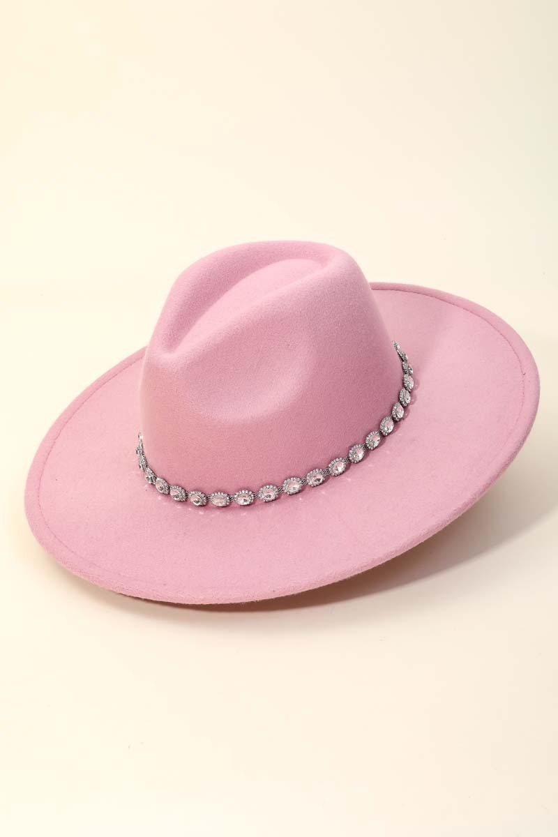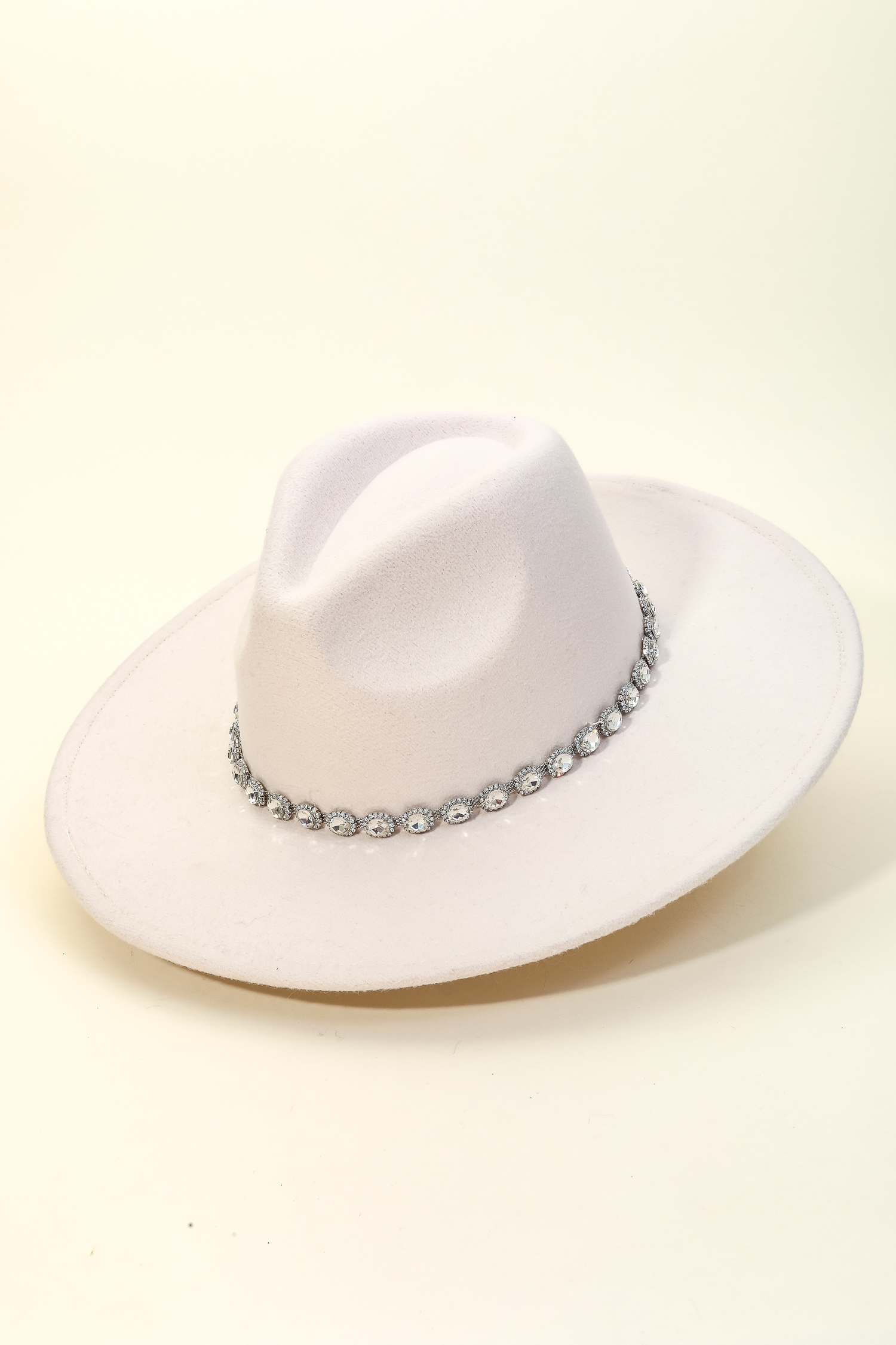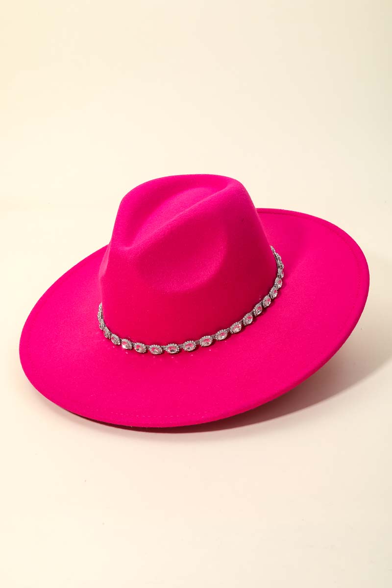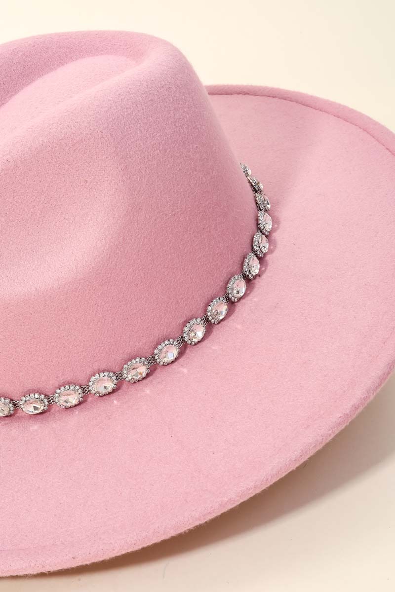 - This new must have fedora hat has a crystal rhinestone strap fedora hat design. This is great to wear during almost any occasion, and can suit casual or formal events perfectly. Faux suede is a synthetic fabric typically 100% polyester made to resemble genuine suede that is produced from a cow hide. This fedora hat is made with 90% Polyester and 10% Alloy. Also made with an adjustable inner string. This item is sold in packs of 1.