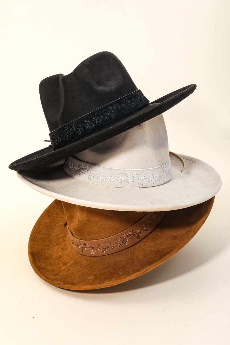 - This stunning fedora hat made into a embroidered flower strap fedora hat design. Perfect for the coming season. Faux suede is a synthetic fabric typically 100% polyester made to resemble genuine suede that is produced from a cow hide. This fedora hat is made with 90% Polyester and 10% PU. Also made with an adjustable inner string. This item is sold in packs of 1.