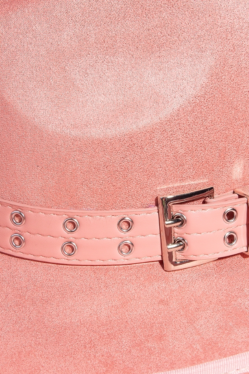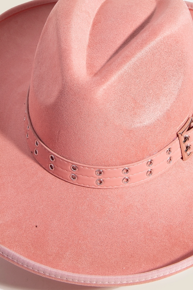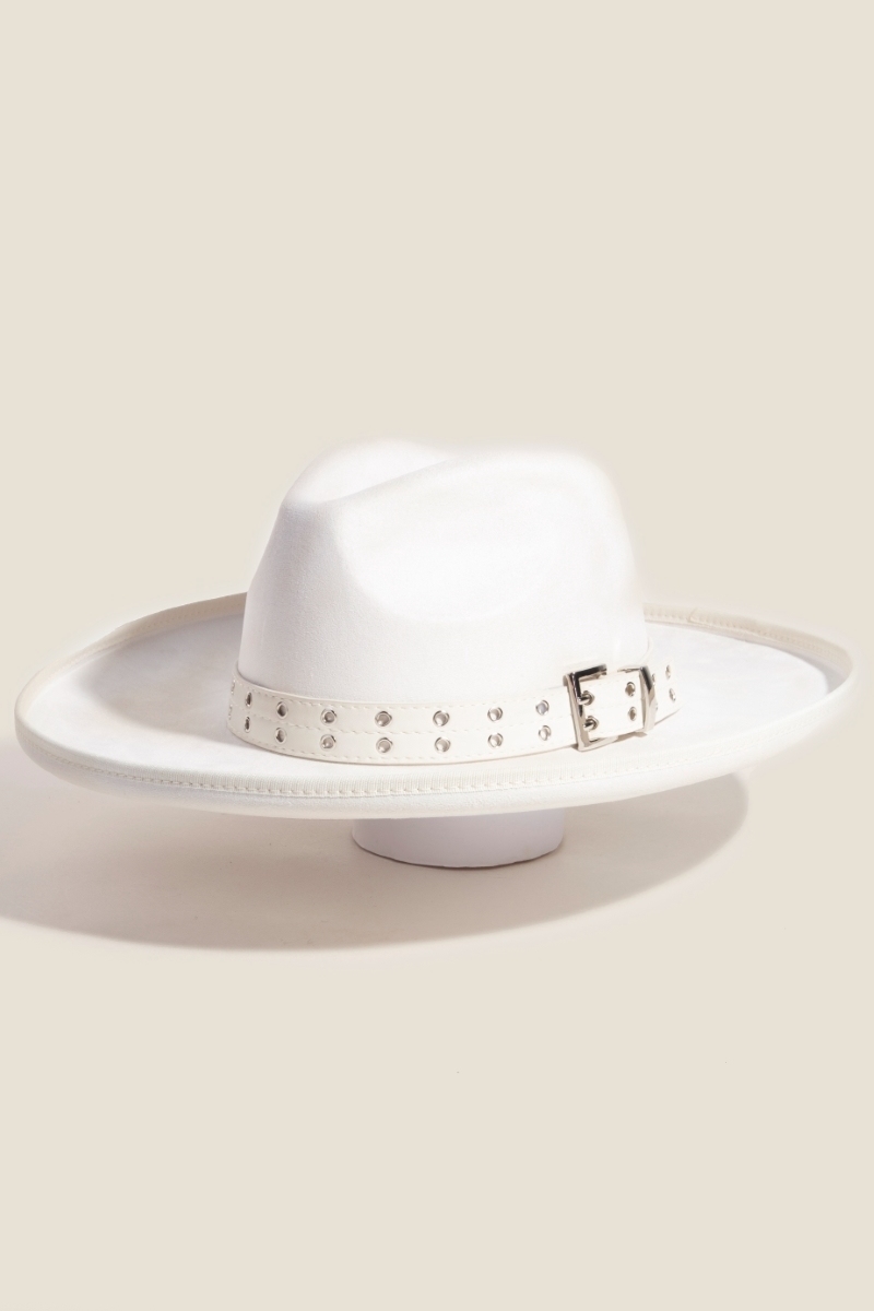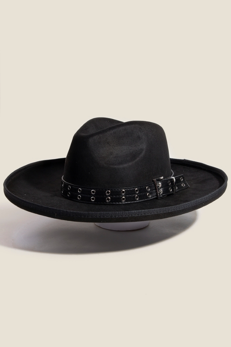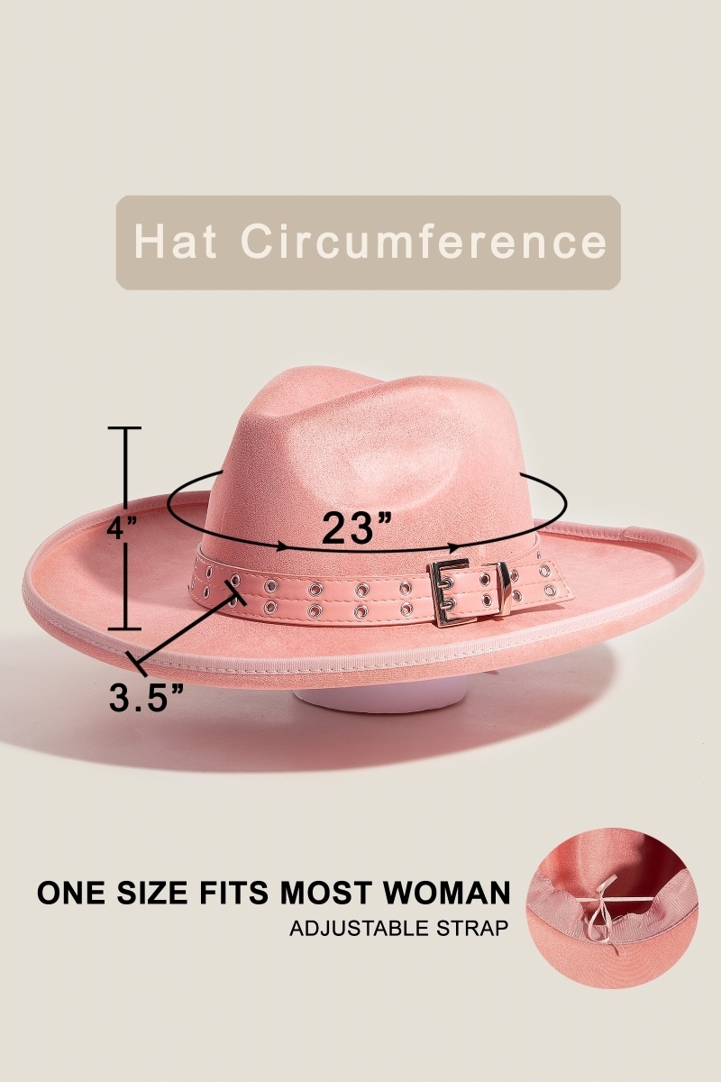 The perfect way to add some edge to your look, this fedora hat radiates a sleek grommet belt faux suede design. Discover a new level of fashion versatility as this fedora hat effortlessly elevates the allure of your attire. Available in BK, IV, PE. This item is sold in packs of 1.