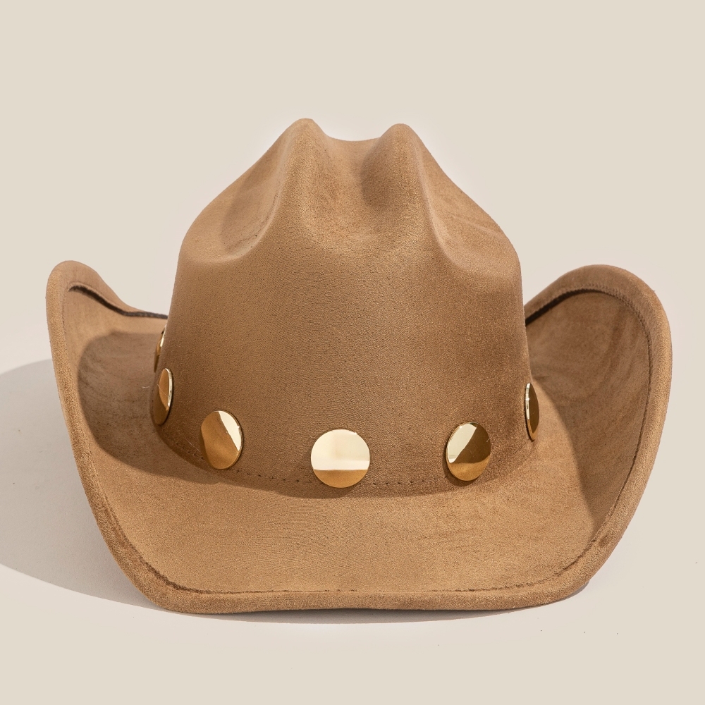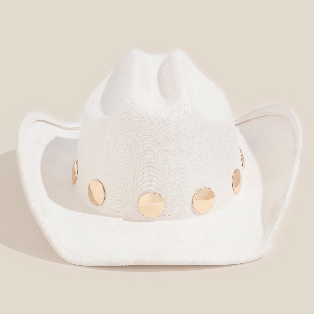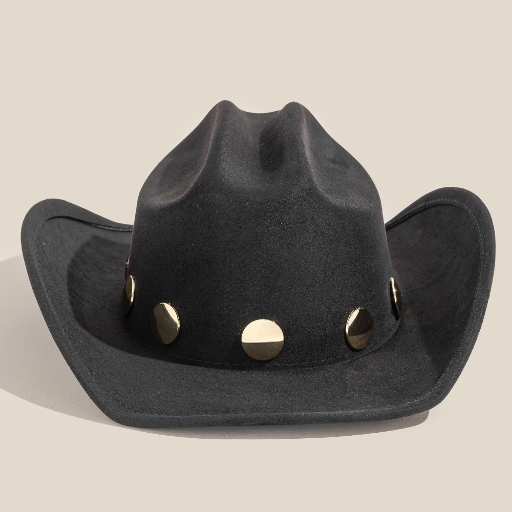 • An instant wardrobe staple, this cowboy hat adds a distinctive polished metallic discs station western design. Perfect for dressing up or down, this versatile cowboy hat adds a touch of sophistication to any look. Available in GBK, GBR, GIV, SBK, SKA. This item is sold in packs of 1.