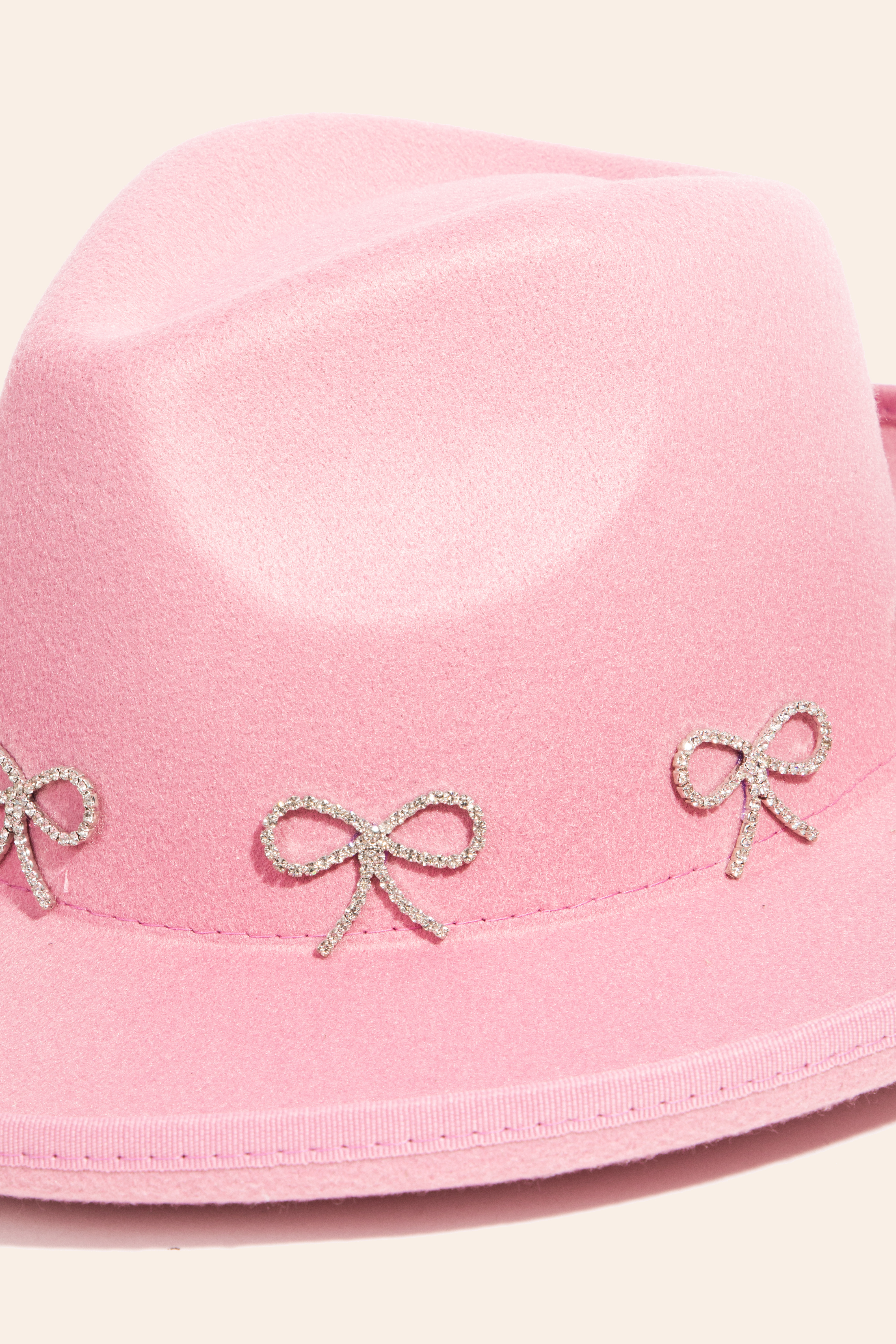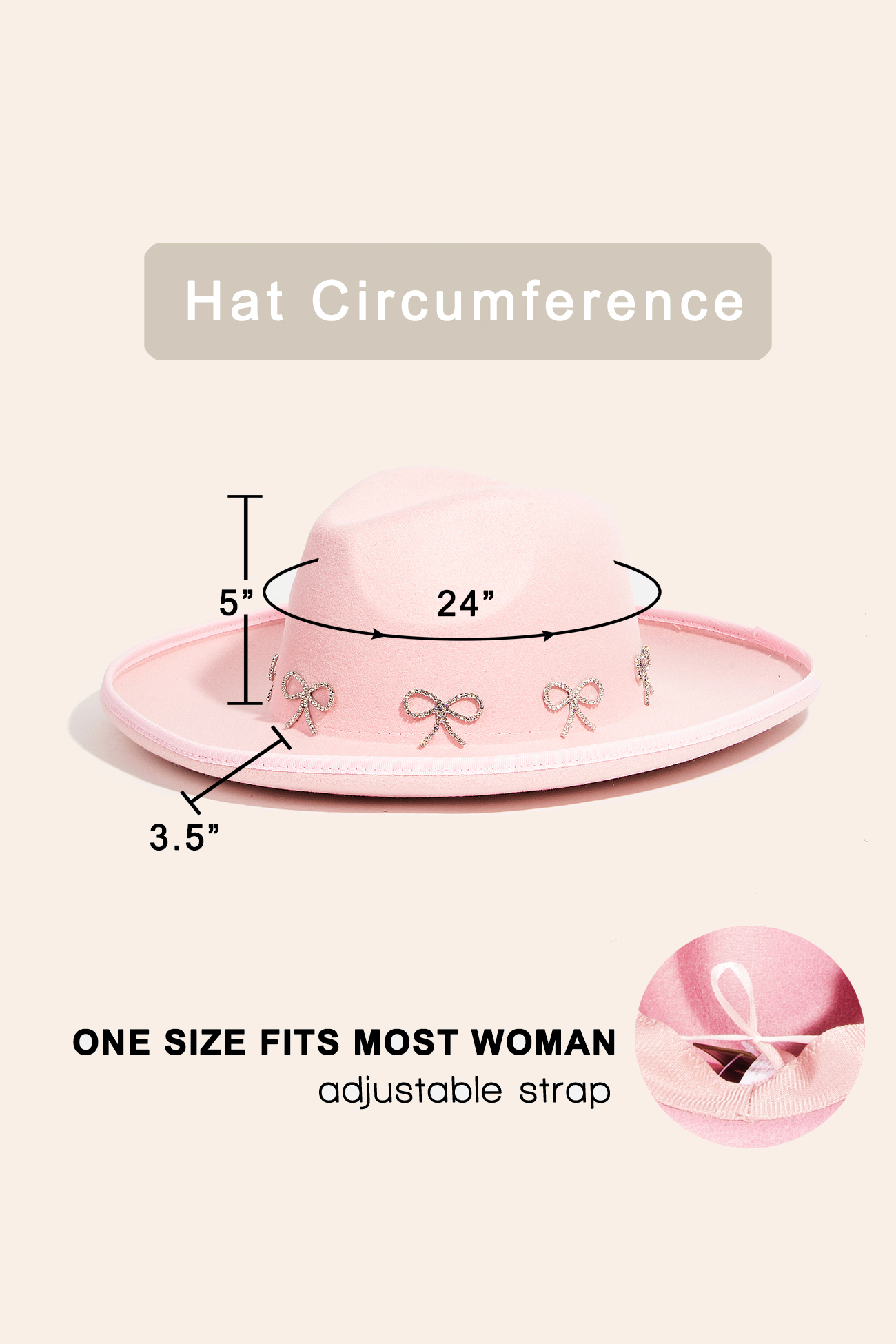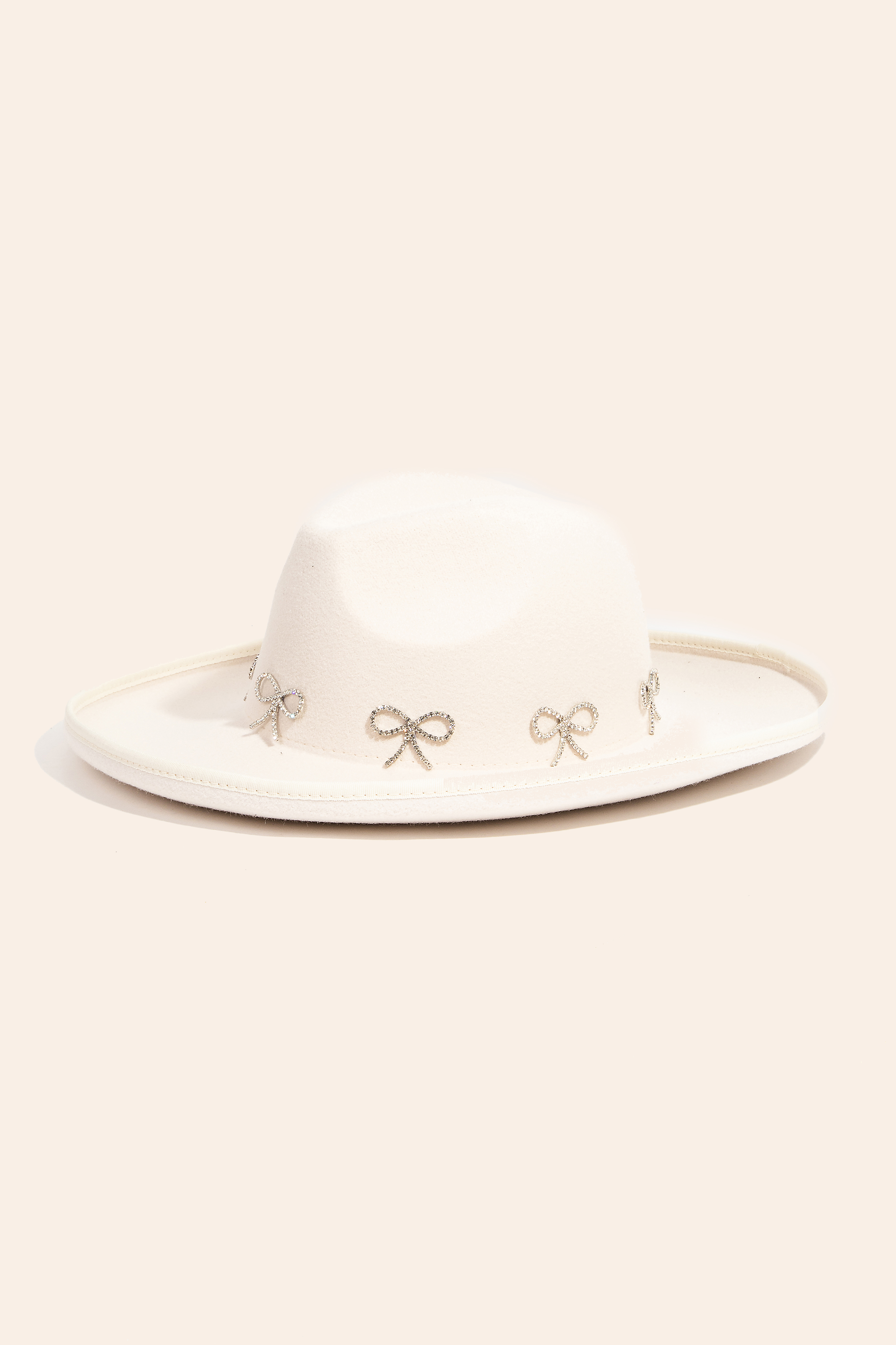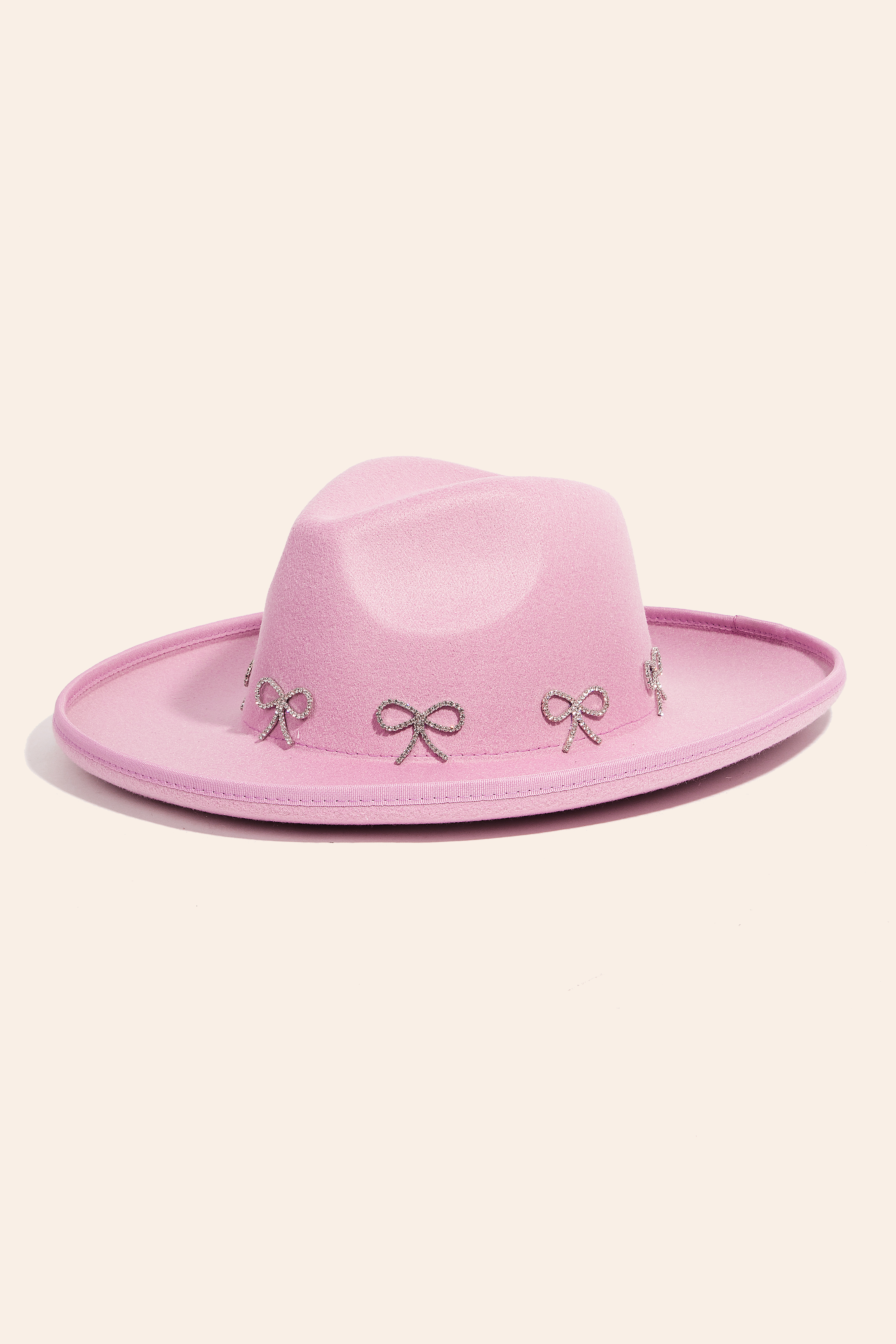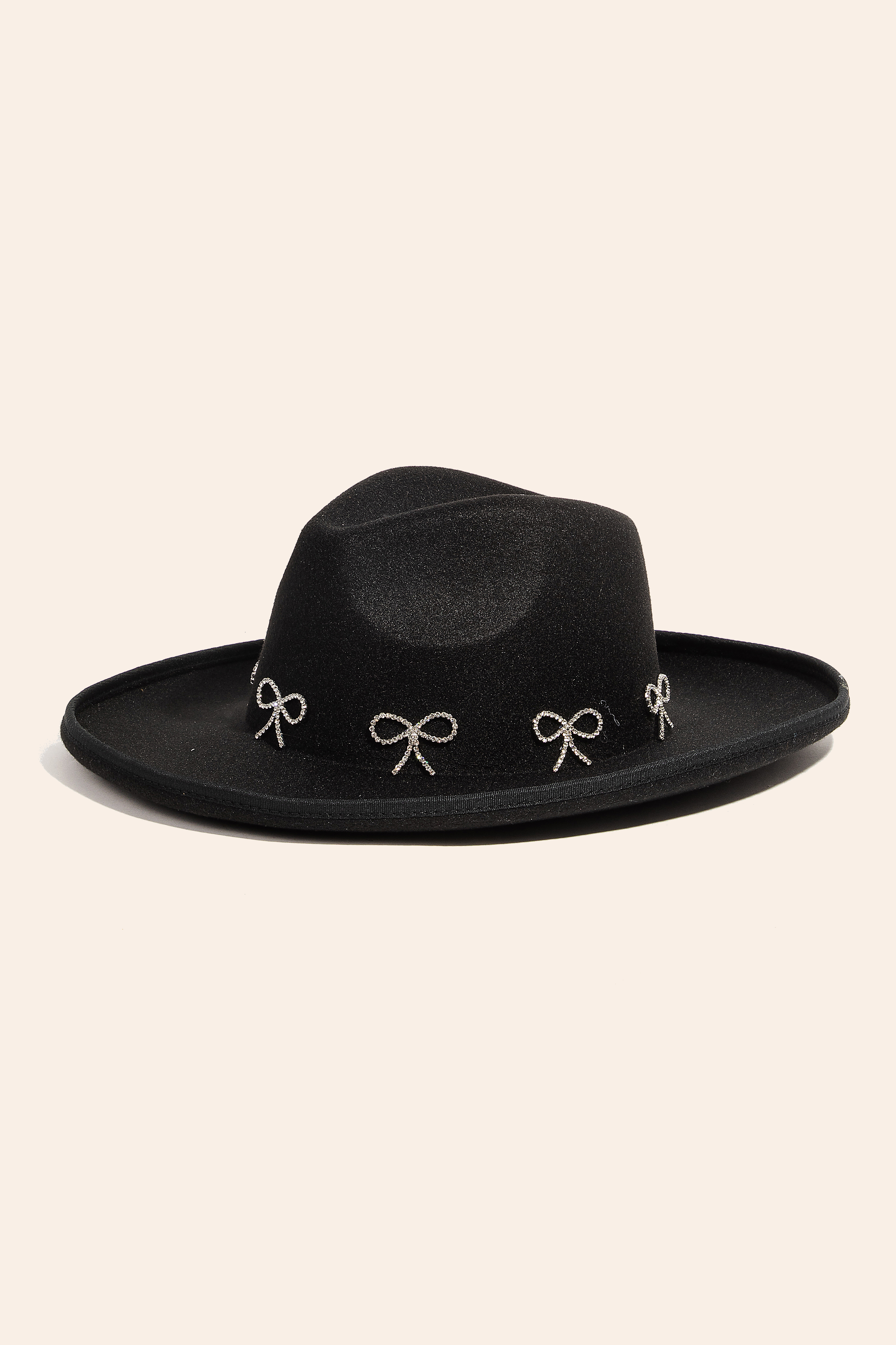 • Effortlessly chic and always on-trend, this fedora hat possesses a fine rhinestone ribbon bow charms design. Elevate your style effortlessly with this versatile fedora hat, enhancing the appeal of any ensemble. Available in BK, IV, PK and PU. This item is sold in packs of 1.