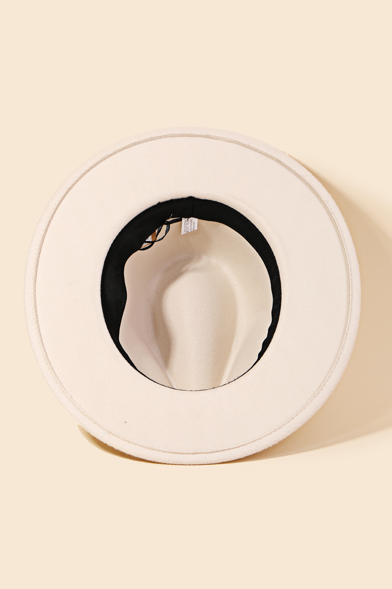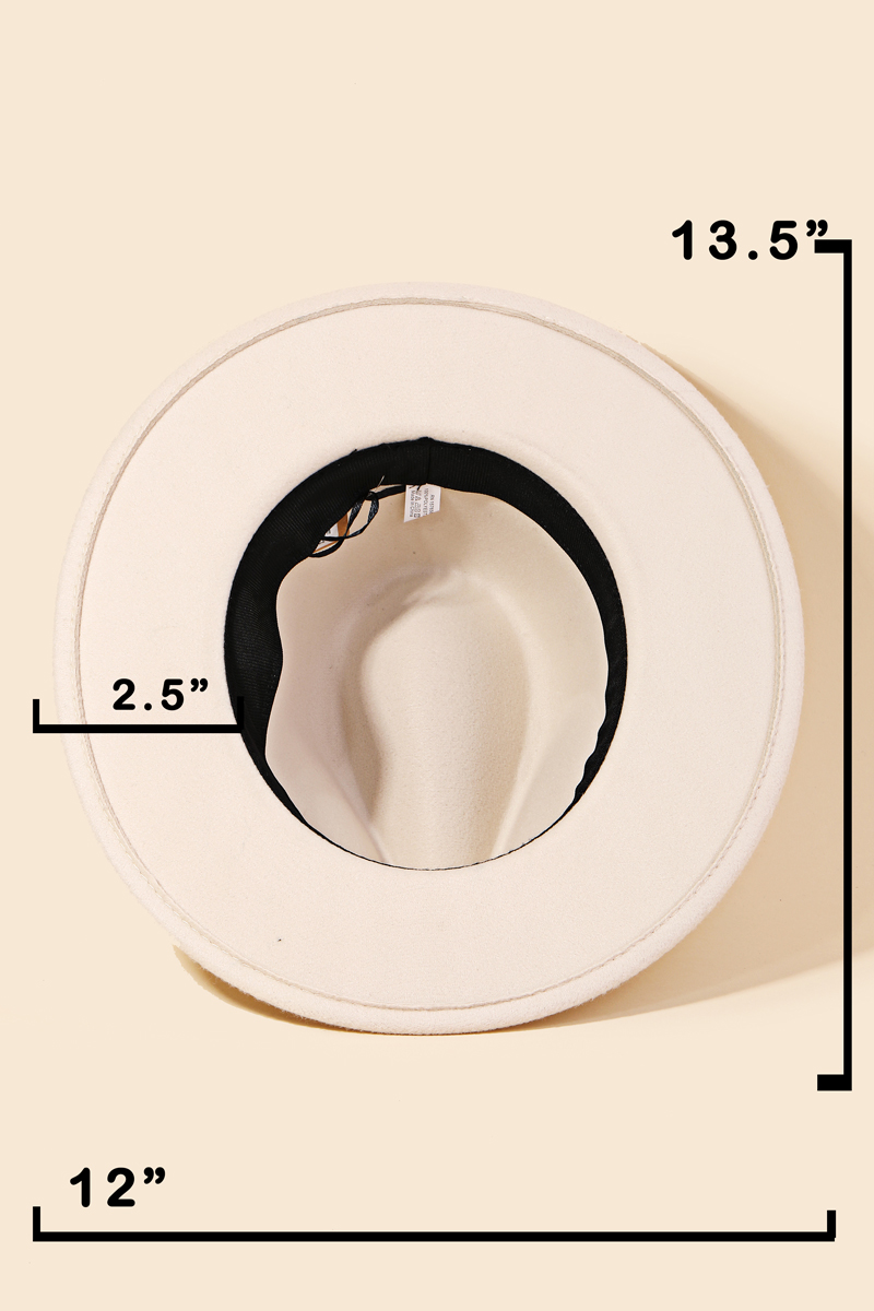 - This stunning must have fedora hat has a unique tribal strap fedora fashion hat design. Perfect for this Spring season! It includes a faux suede that is a synthetic fabric typically 100% polyester made to resemble genuine suede that is produced from a cow hide. This fedora hat is made with 100% Polyester. Also made with an adjustable inner string. This item is sold in packs of 1.