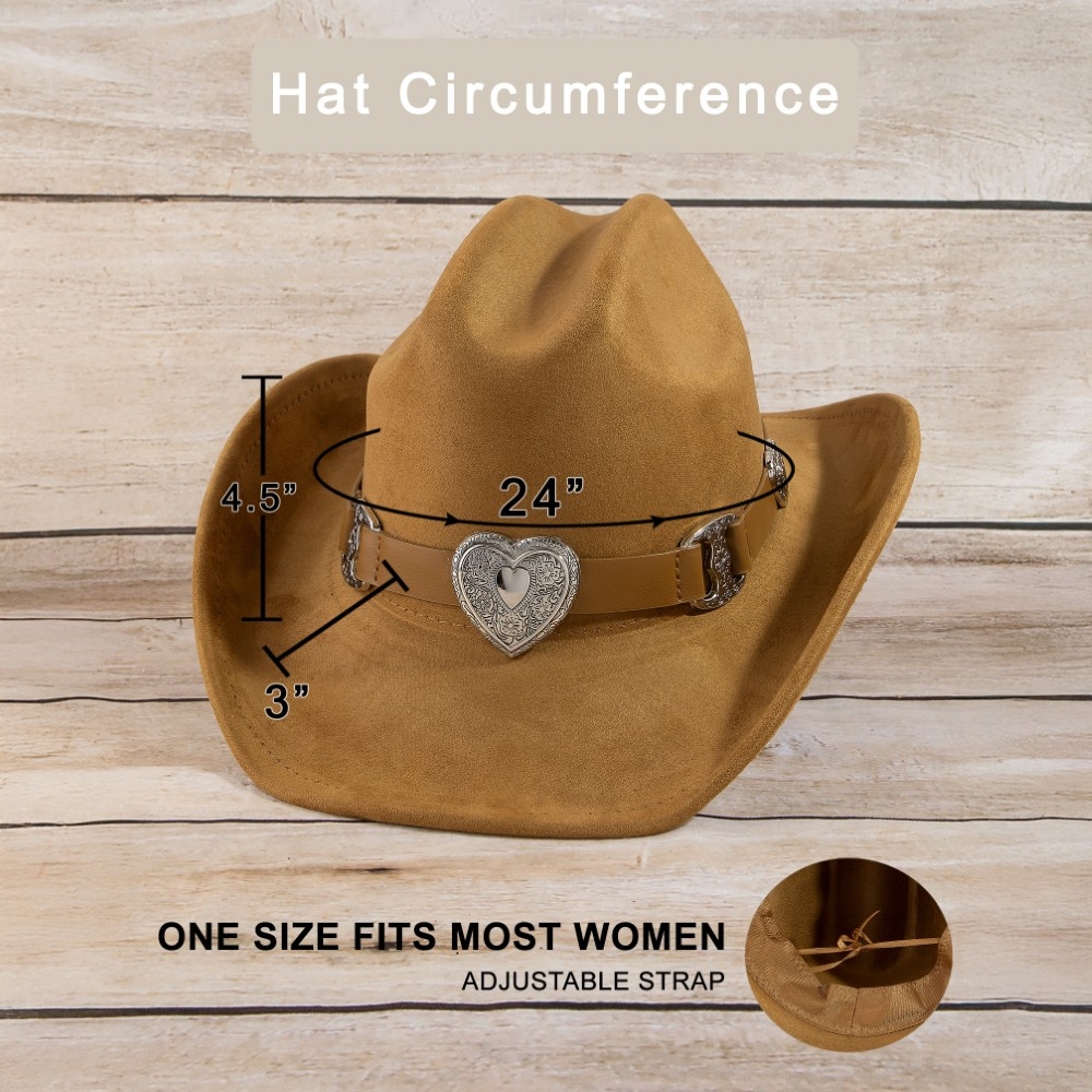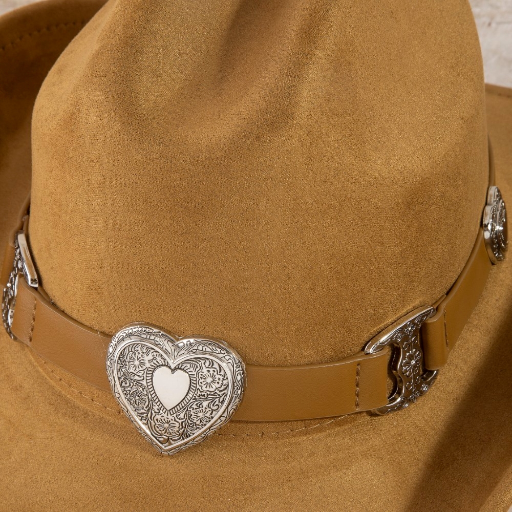 Effortlessly chic and sophisticated, this cowboy hat features a distinct western heart buckle design. This cowboy hat is the perfect way to add a touch of elegance to any outfit. Available in BK, BKS, IV, BR, BRG, BRS, BUG, KA, KAS, OLS, RUG, RUS and SBR. This item is sold in packs of 1.