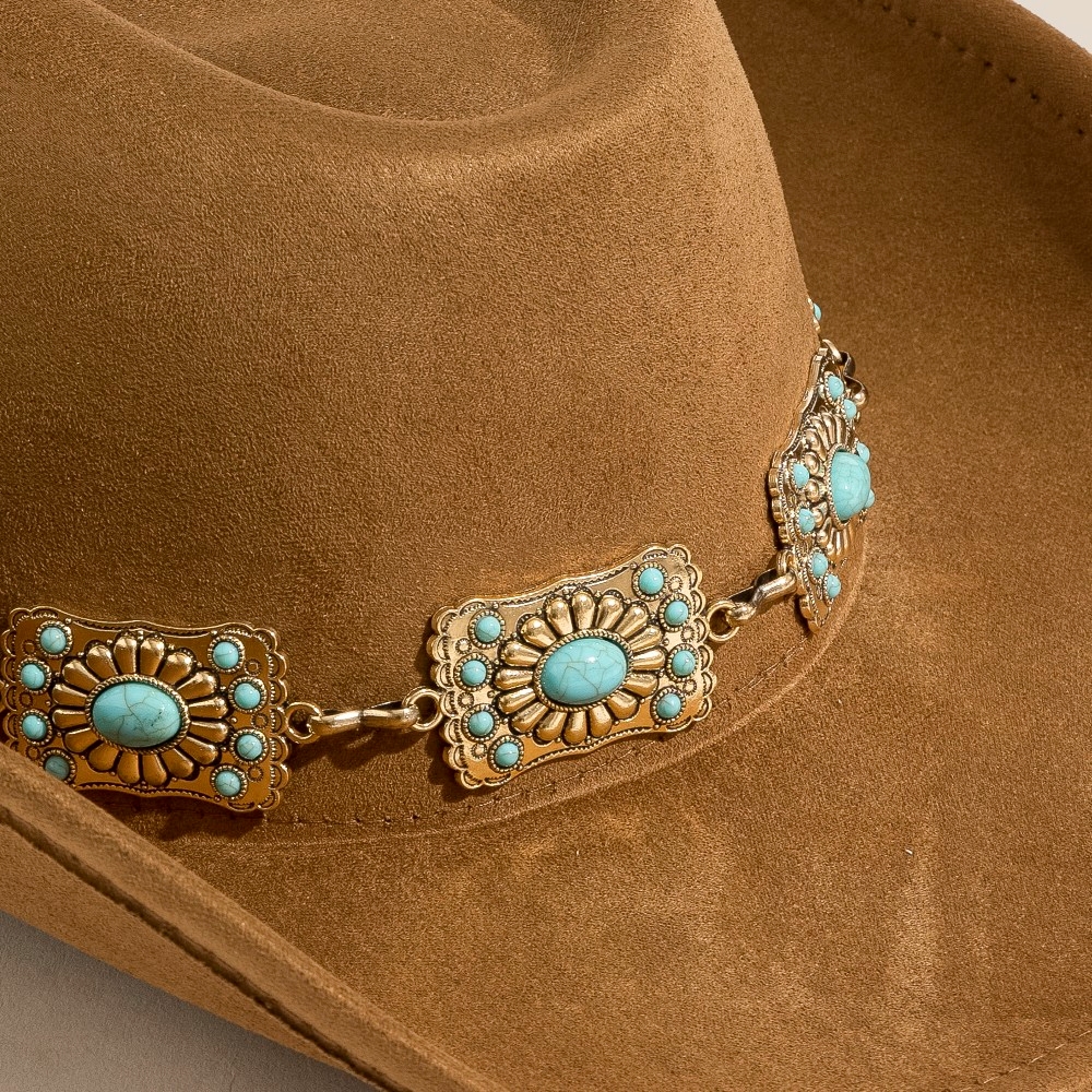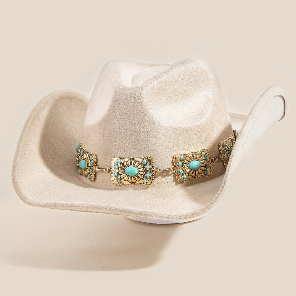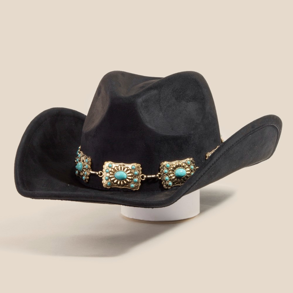 - A bold and daring choice, perfect for those who want to stand out from the crowd, this cowboy hat includes a stunning western rectangle concho chain design. Elevate your personal style effortlessly with this versatile cowboy hat, an essential component for a refined wardrobe. Available in BR, GBK, IV, TP. This item is sold in packs of 1.
