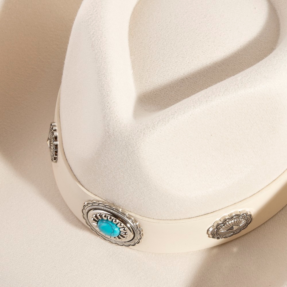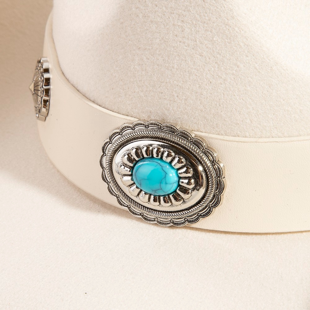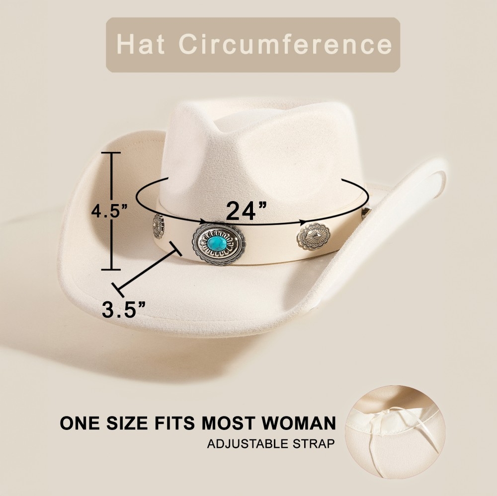 - A timeless piece that will never go out of style, this cowboy hat incorporates a remarkable western turquoise concho strap design. This cowboy hat is ideal for both casual and formal events, adding a touch of sophistication to any outfit. Available in IV. This item is sold in packs of 1.