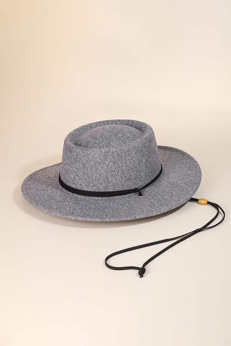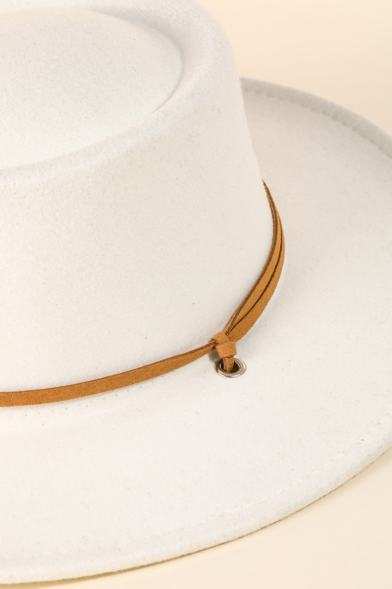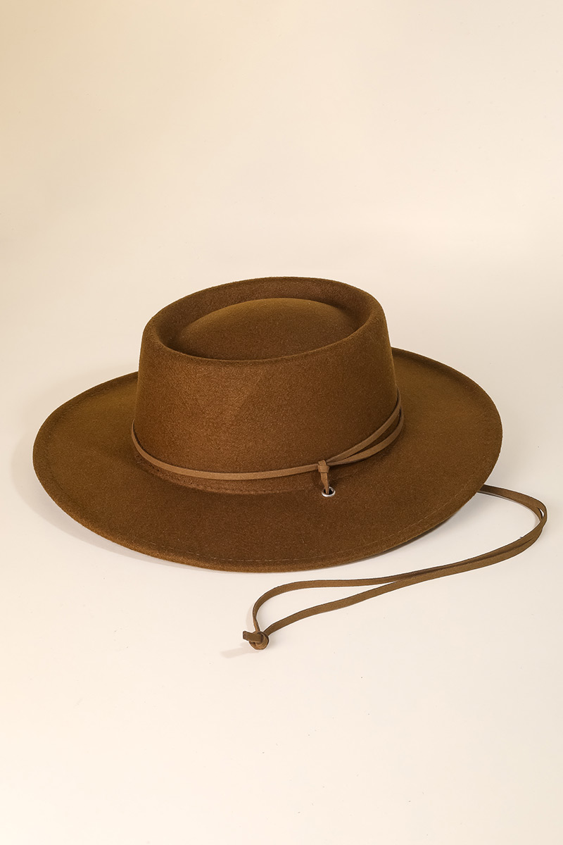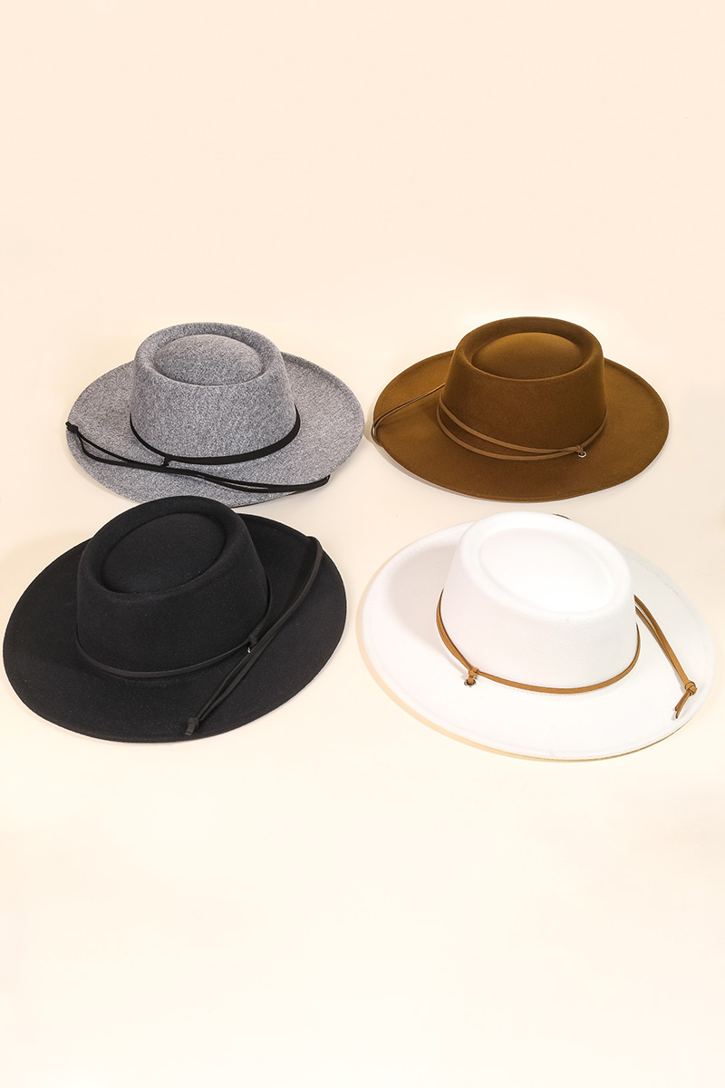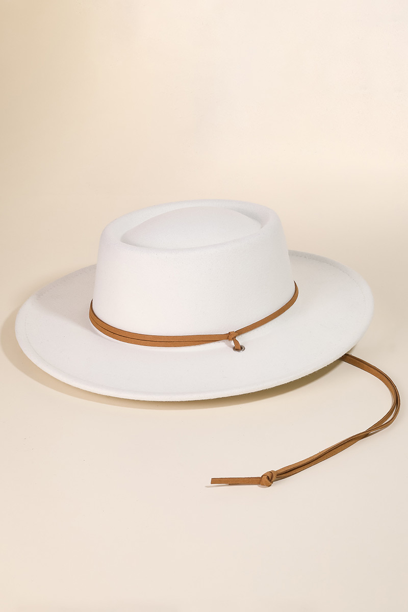 • A simply stunning in season must have hat that features a faux leather chin strap pork pie hat design. Perfectly fitting for this Spring season! Available in BK, BR, GR and IV.