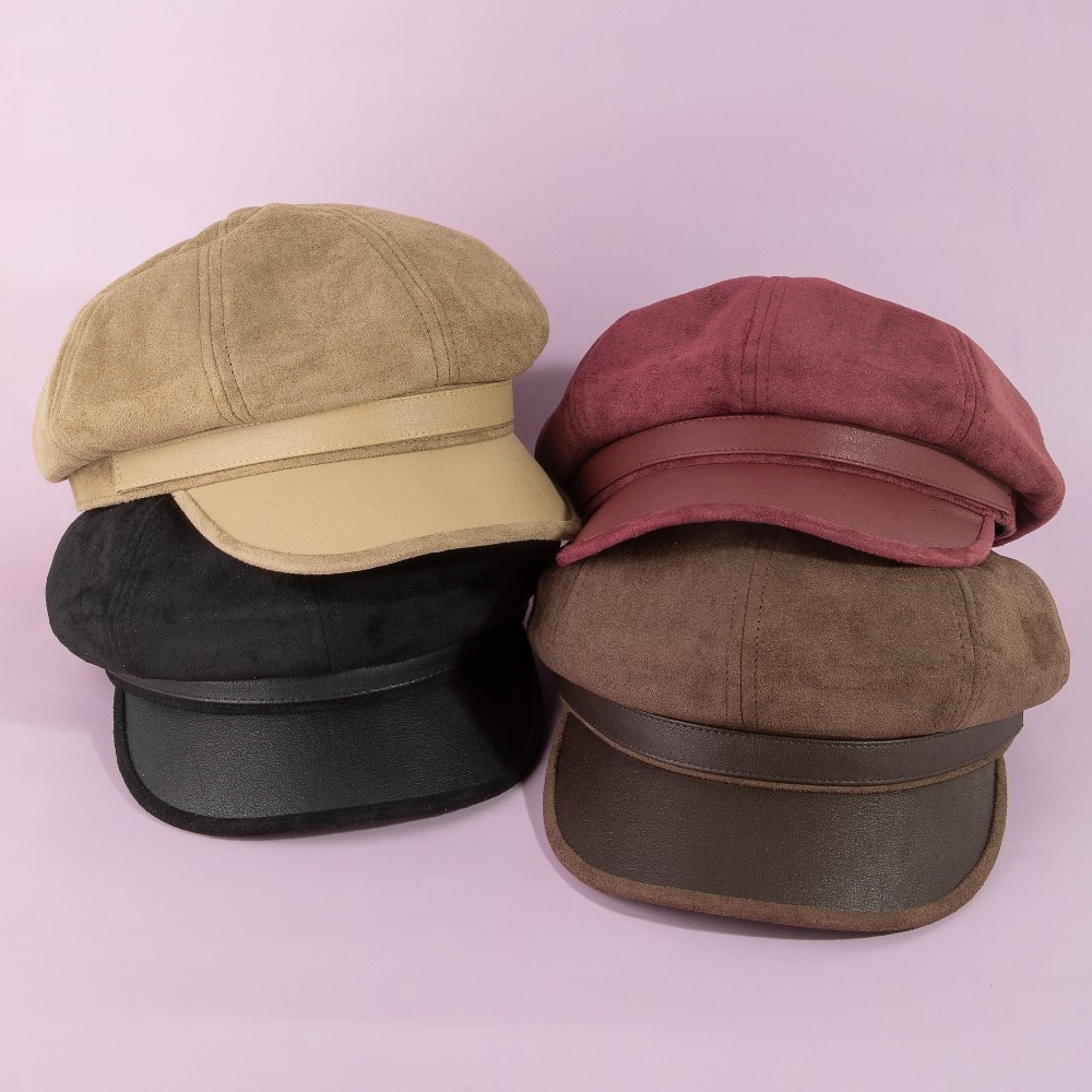 This piece is both elegant and versatile, this cap embodies a sophisticated leather newsboys design. Perfect for adding some texture and dimension to any outfit, this cap is a must-have. Available in BK, BU, DBR, IV. This item is sold in packs of 1.