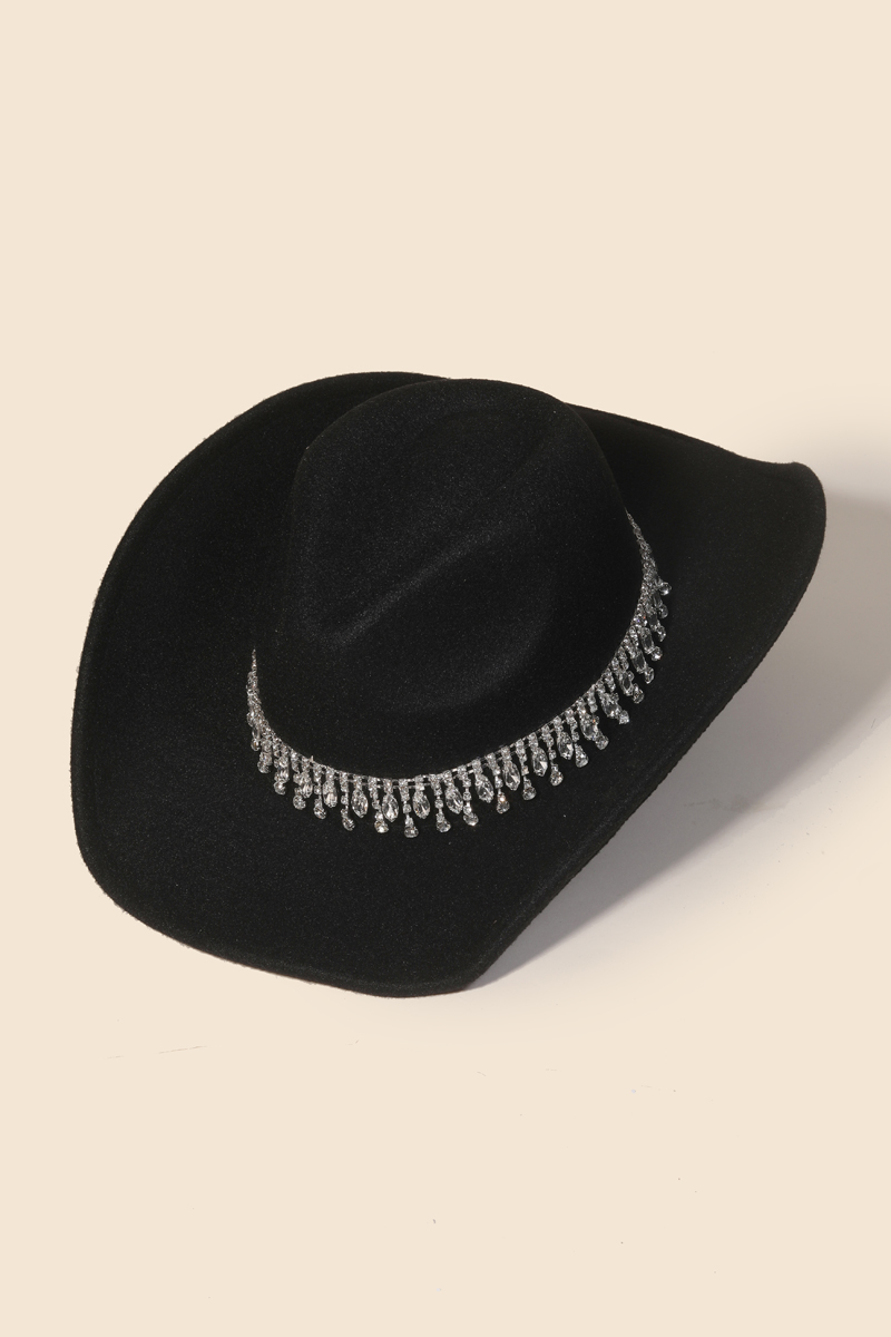 • A must-have addition to any cowboy hat collection, this cowboy hat contains a special rhinestone fringe chain design. Add a touch of glamour to your wardrobe with this versatile cowboy hat, perfect for enhancing the elegance of any look. Available in BK, IV and FU. This item is sold in packs of 1.