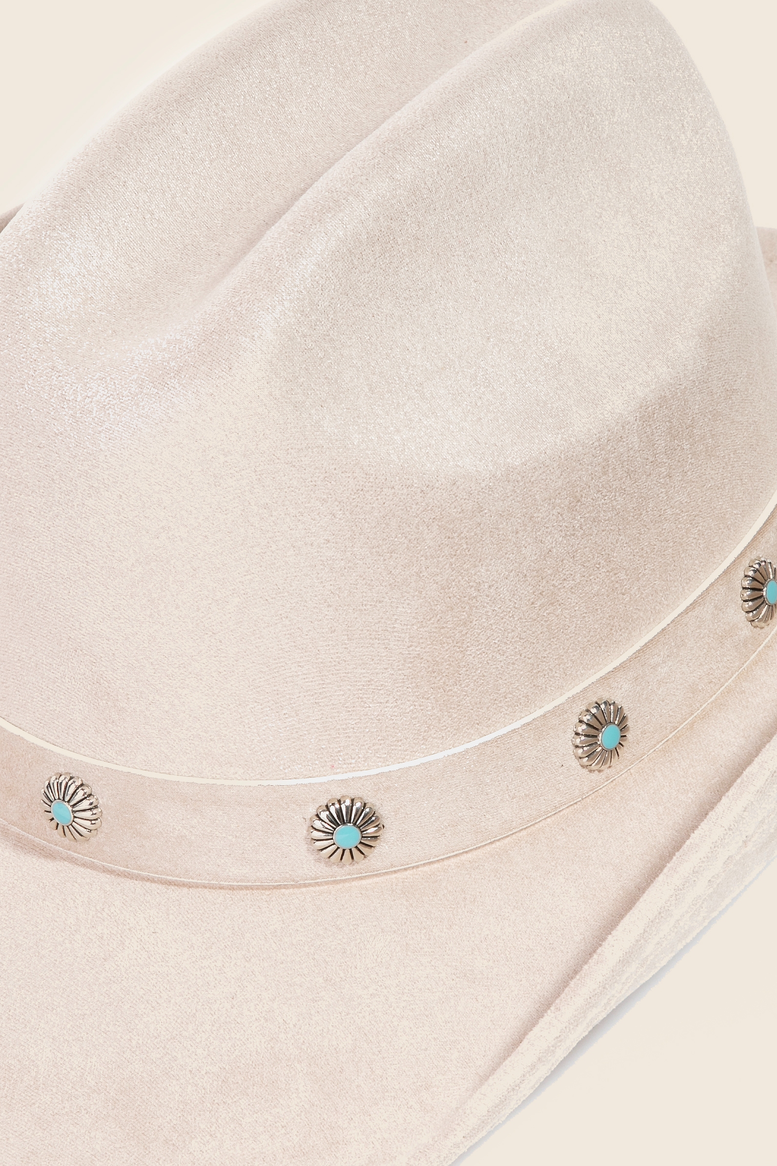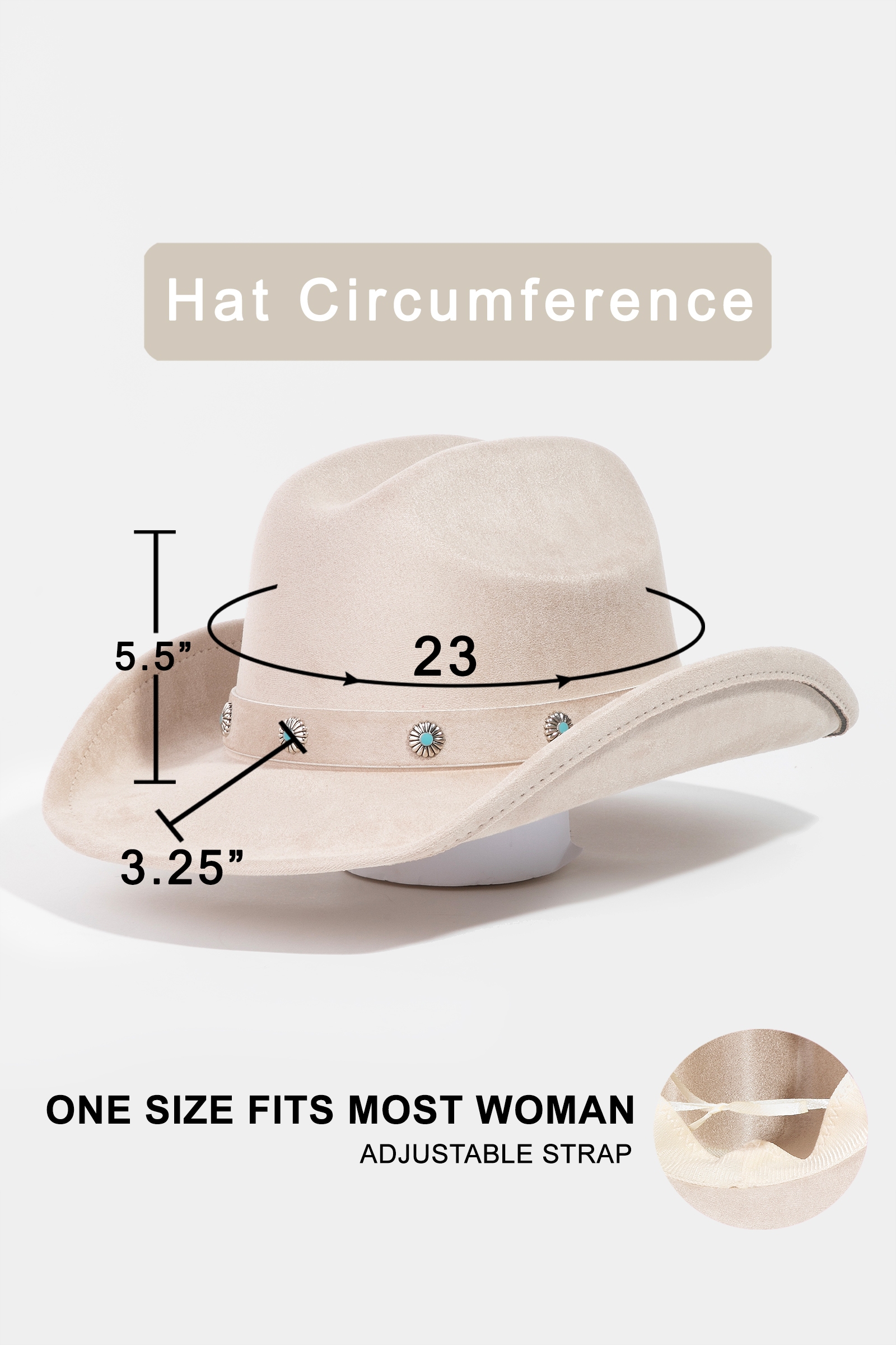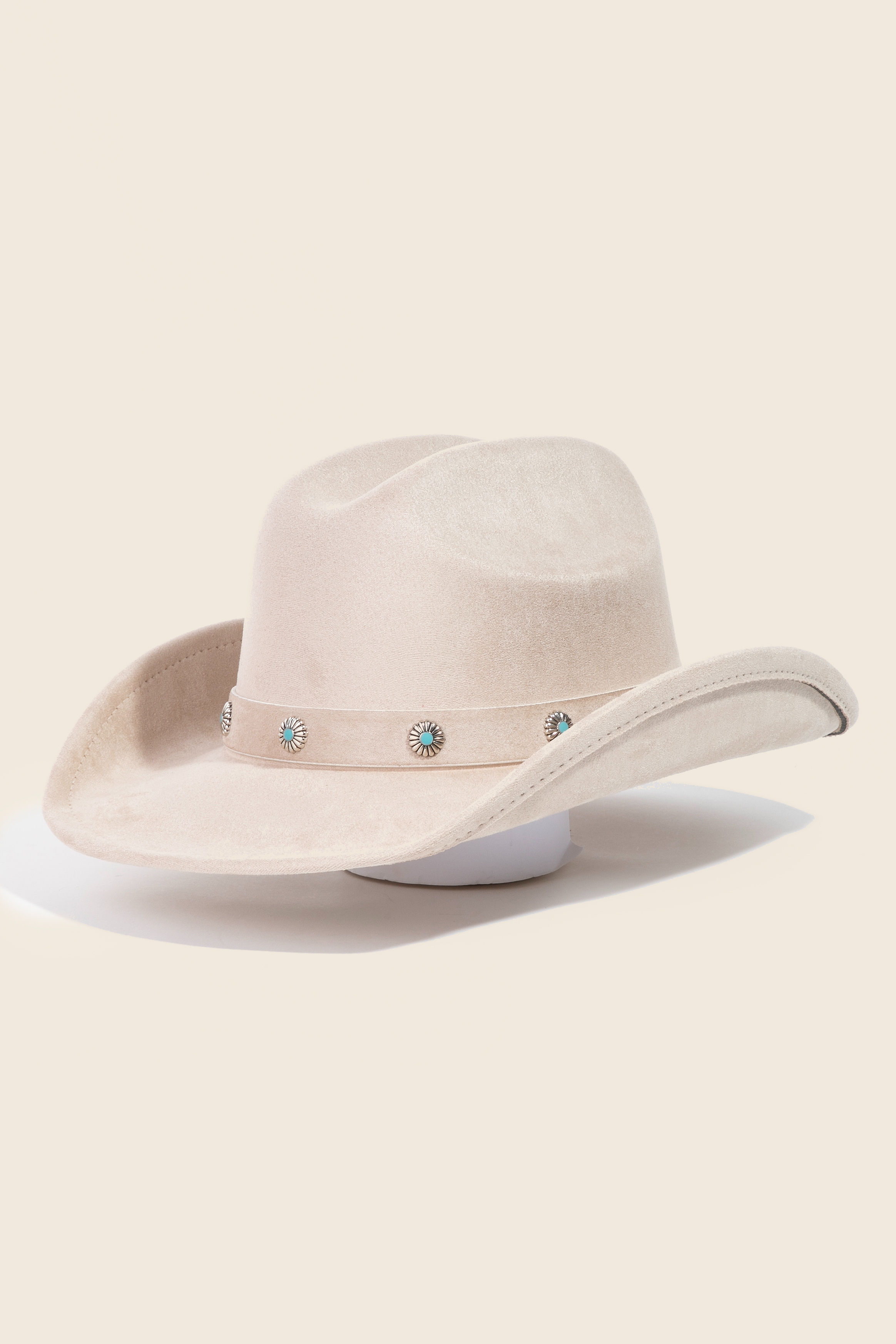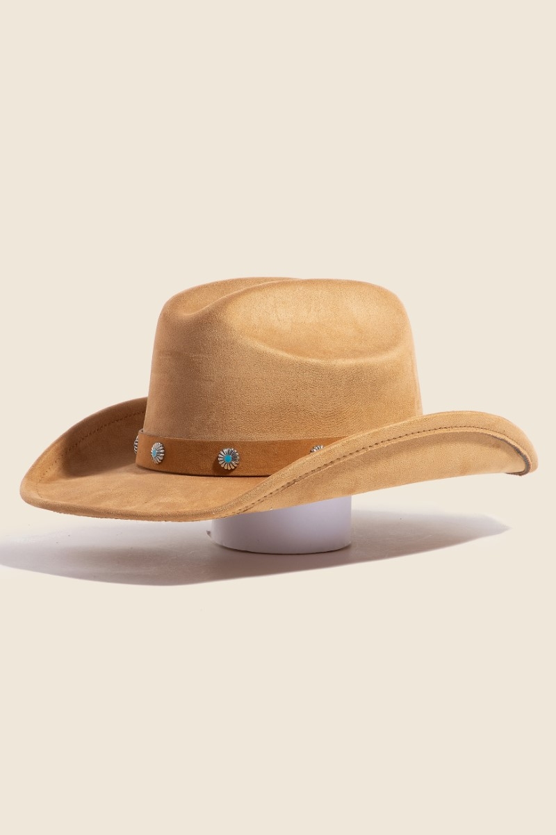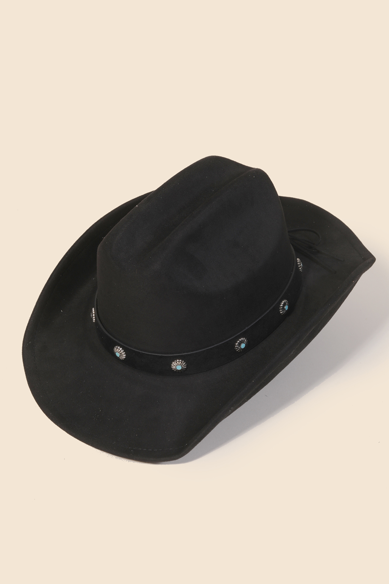 The perfect way to complete any outfit, this cowboy hat brings a one-of-a-kind studded flower strap western design. This item is ideal for those who want to add some personality to their wardrobe without being too bold. Available in CA, IV, TP and BK. This item is sold in packs of 12.