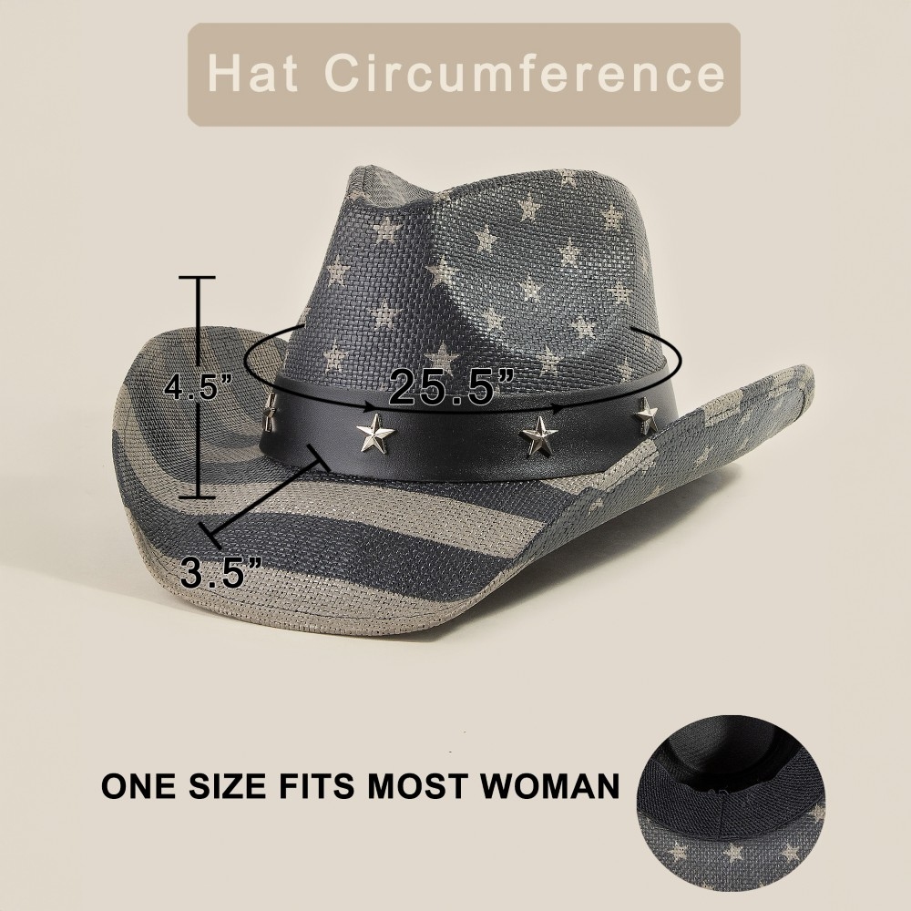 Bold, daring, and endlessly stylish, this cowboy hat emanates an elegant usa flag with studded stars design. This cowboy hat is ideal for both casual and formal events, adding a touch of sophistication to any outfit. Available in BK, BL and MU. This item is sold in packs of 1.