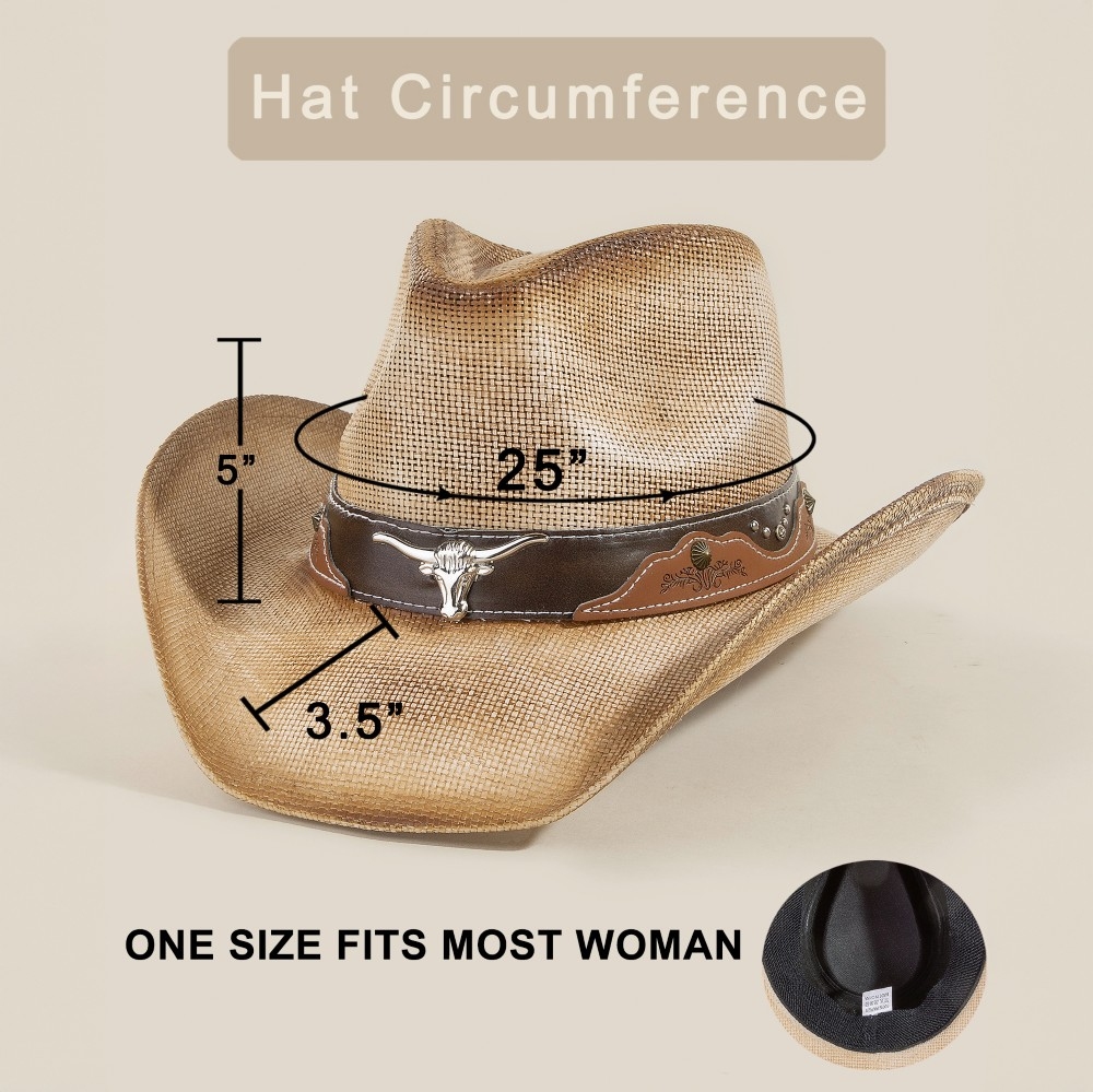 - A stunning addition to any jewelry collection, this cowboy hat possesses a fine western long horn strap trim straw design. This item is the perfect finishing touch to any outfit, adding a touch of glamour and sophistication. Available in BR, KA. This item is sold in packs of 1.