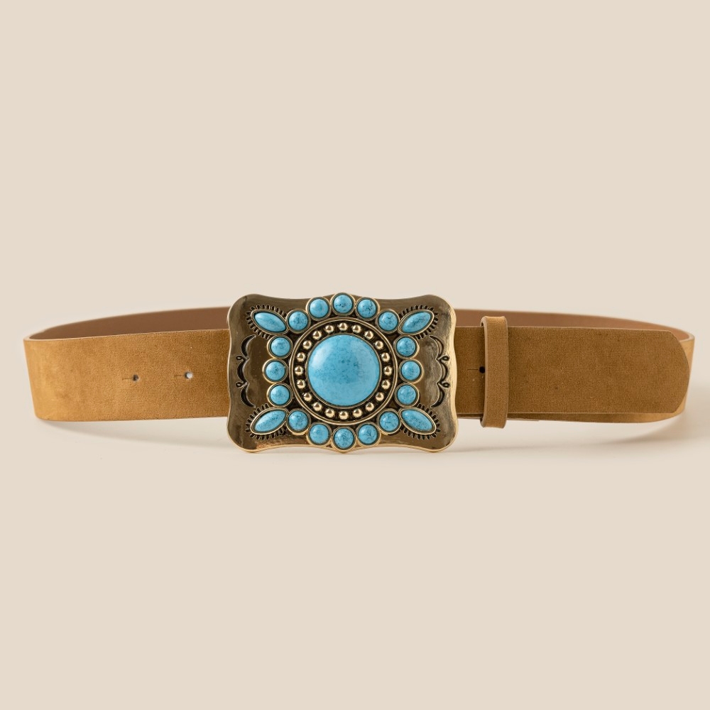 Guaranteed to add a touch of glamour to any outfit, this belt flaunts a luxurious large western turquoise stone concho buckle design. Discover a new level of fashion versatility as this belt effortlessly elevates the allure of your attire. Available in GBK, GBR, GCO, SBK. This item is sold in packs of 1.
