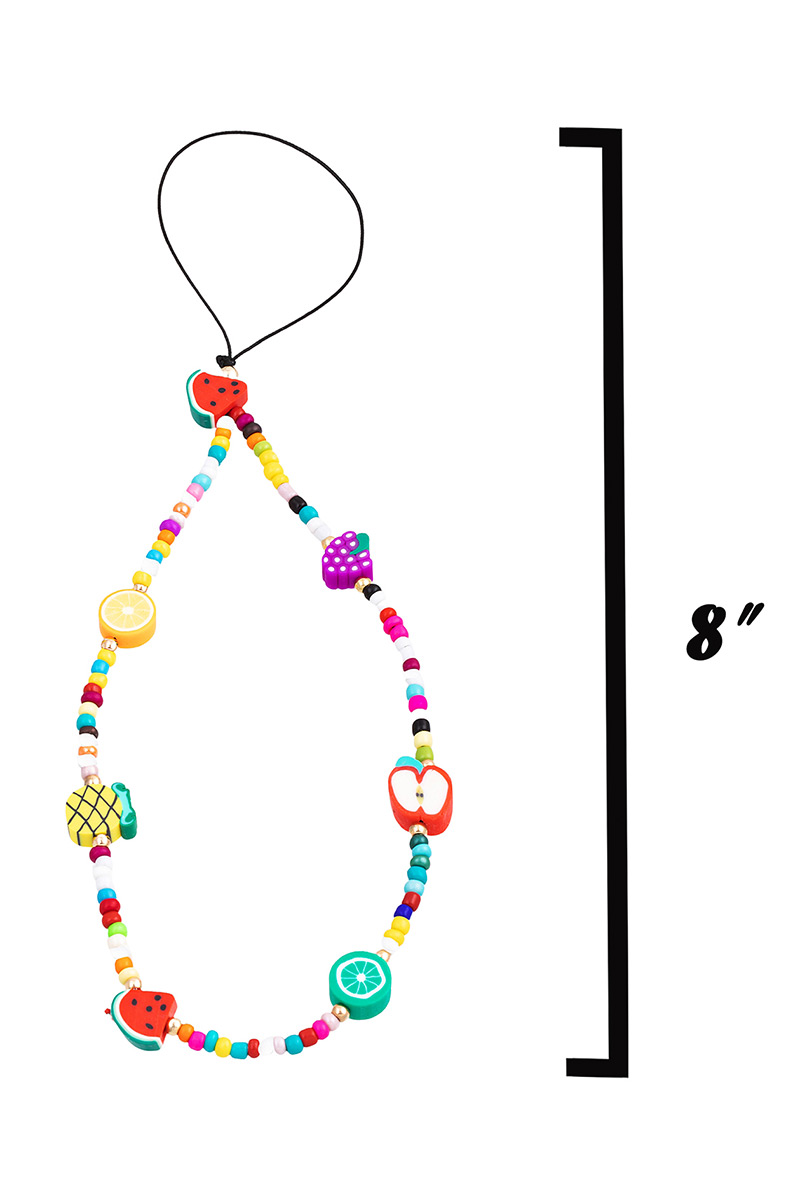 "A must have accessory have a mixed fruit bead charm phone strap design. Perfect for the summer! Available in GDMLT. "