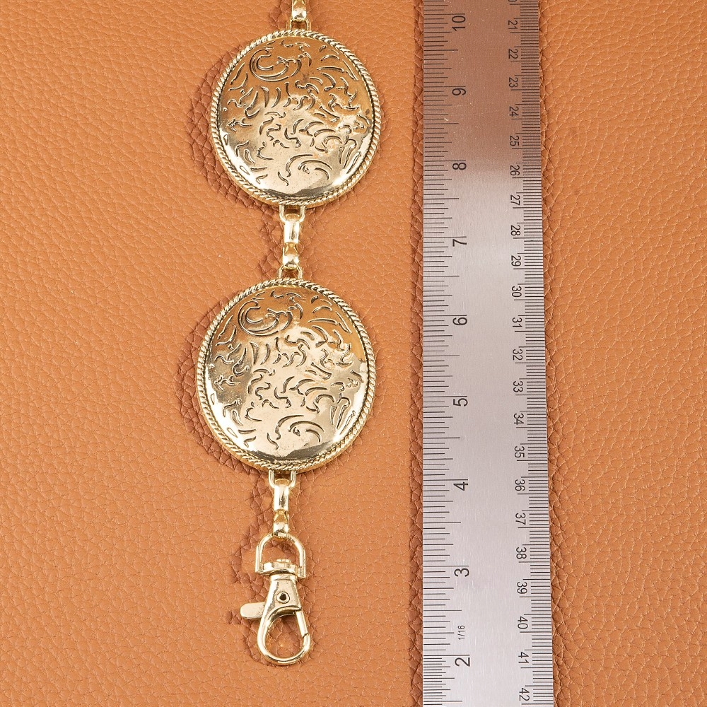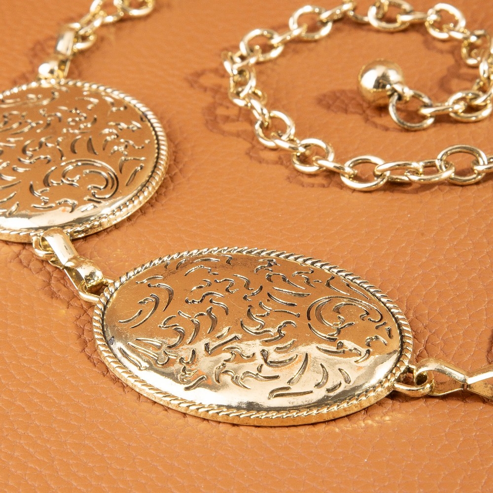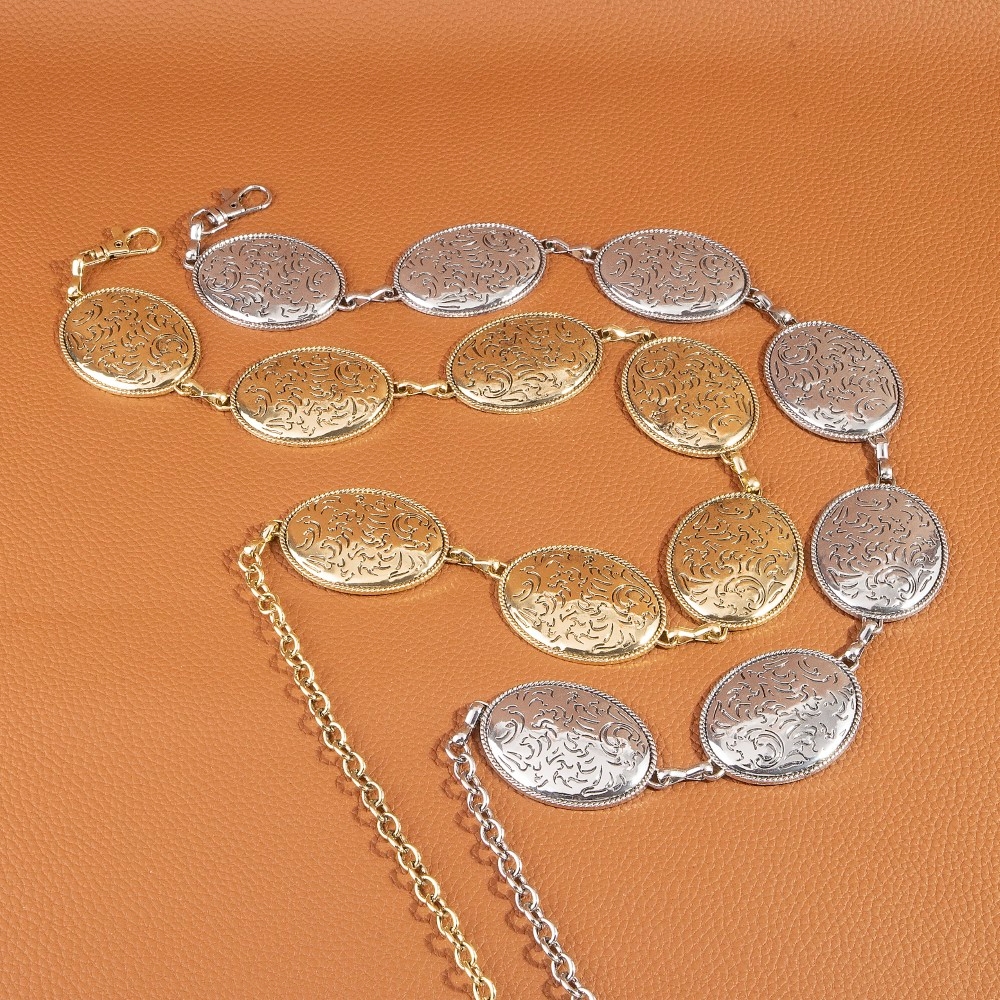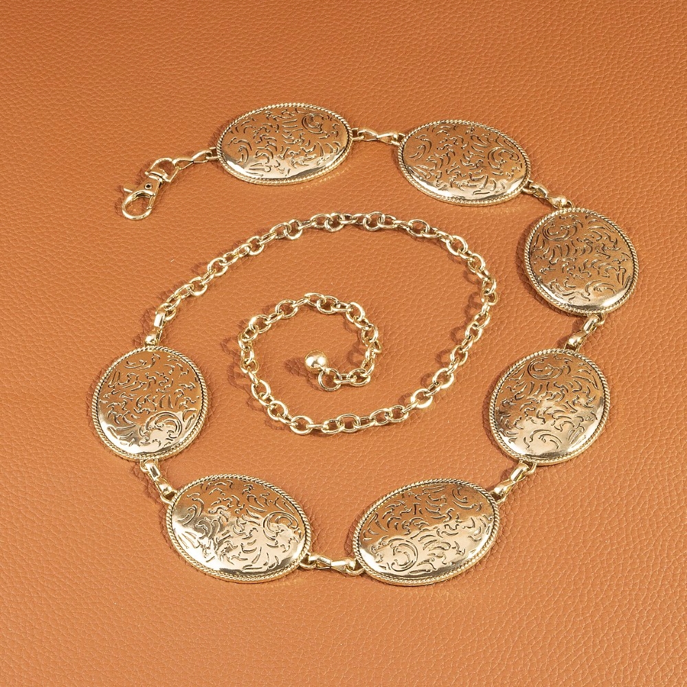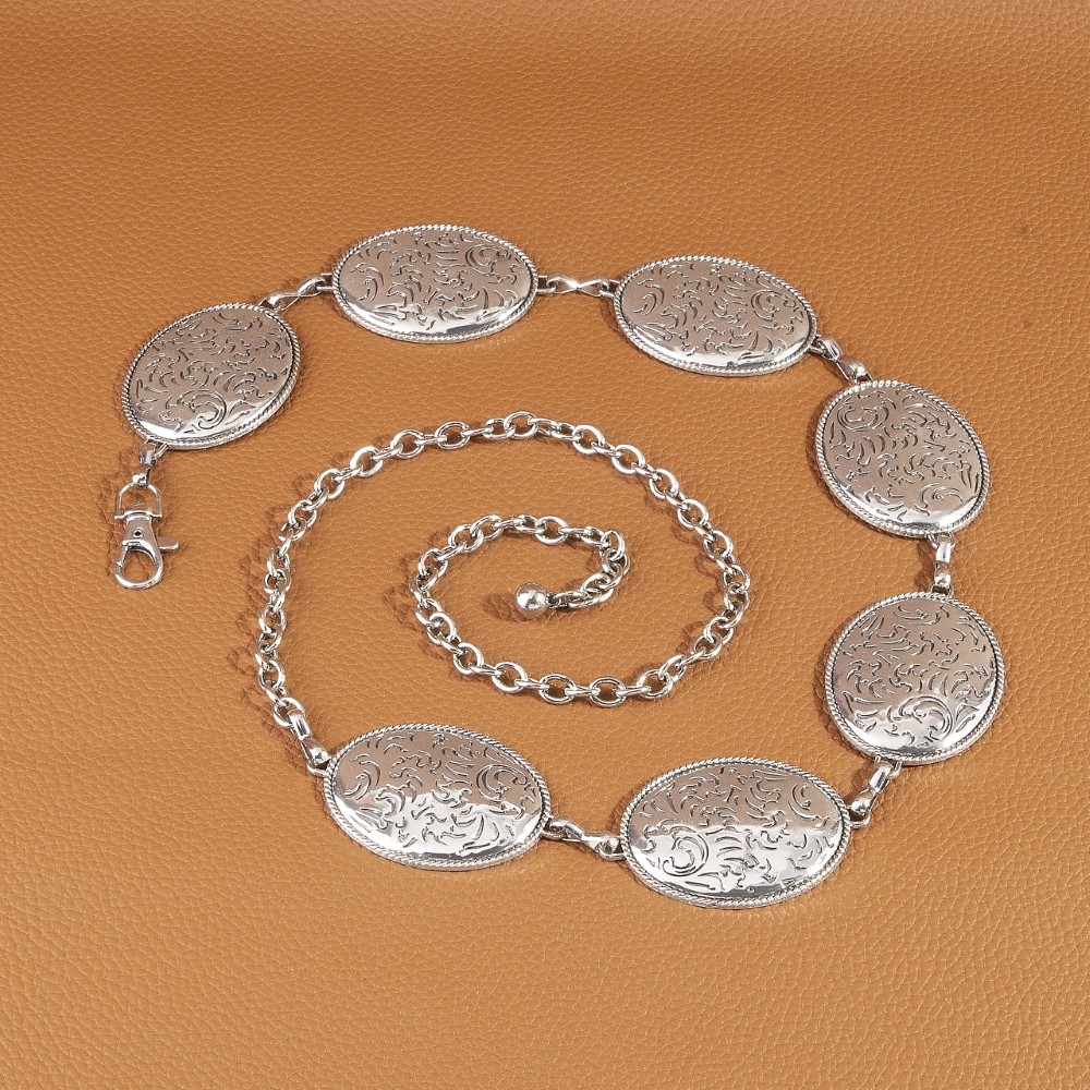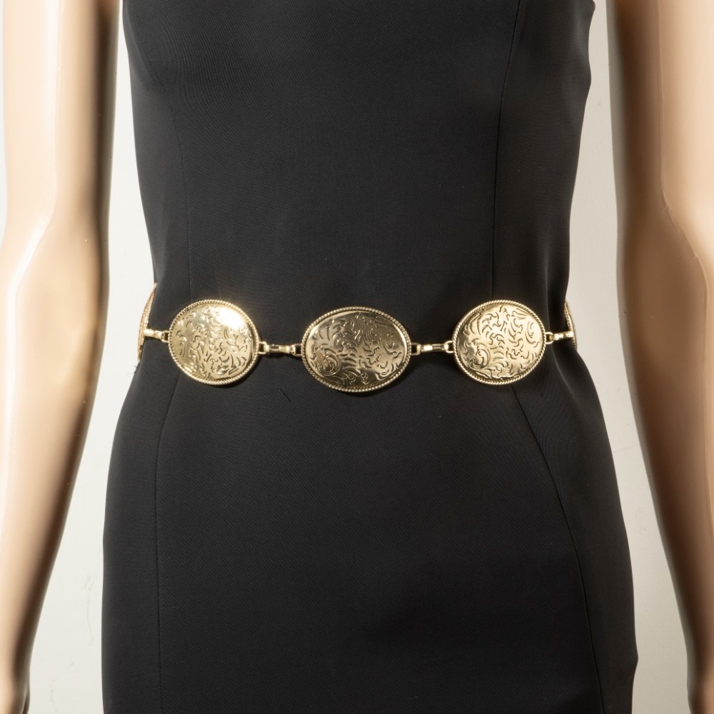 The perfect way to add some sparkle to your outfit, this chain belt flaunts a luxurious oval floral etched concho design. This item is a great way to add some texture and dimension to any outfit. Available in G, S. This item is sold in packs of 1.