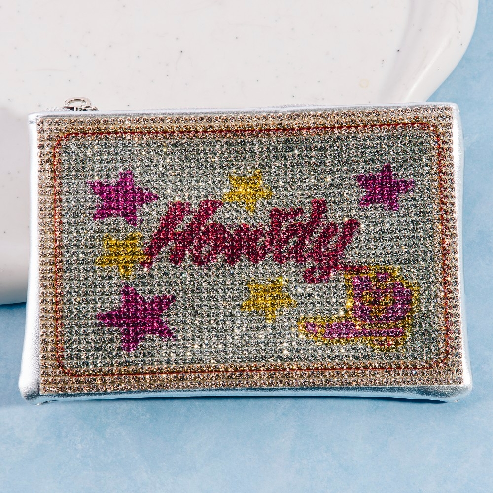 Add a touch of elegance and glamour to your look, this coin purse features a distinct pave howdy design. A must-have coin purse for anyone who loves to add some flair to their outfits. This item is sold in packs of 1.