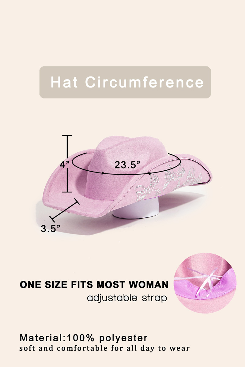 • A classic design with a modern twist, this cowboy hat displays a unique rhinestone ribbon embroidered design. This item is perfect for adding some color and vibrancy to any outfit. Available in BK, IV, PK, PU. This item is sold in packs of 1.