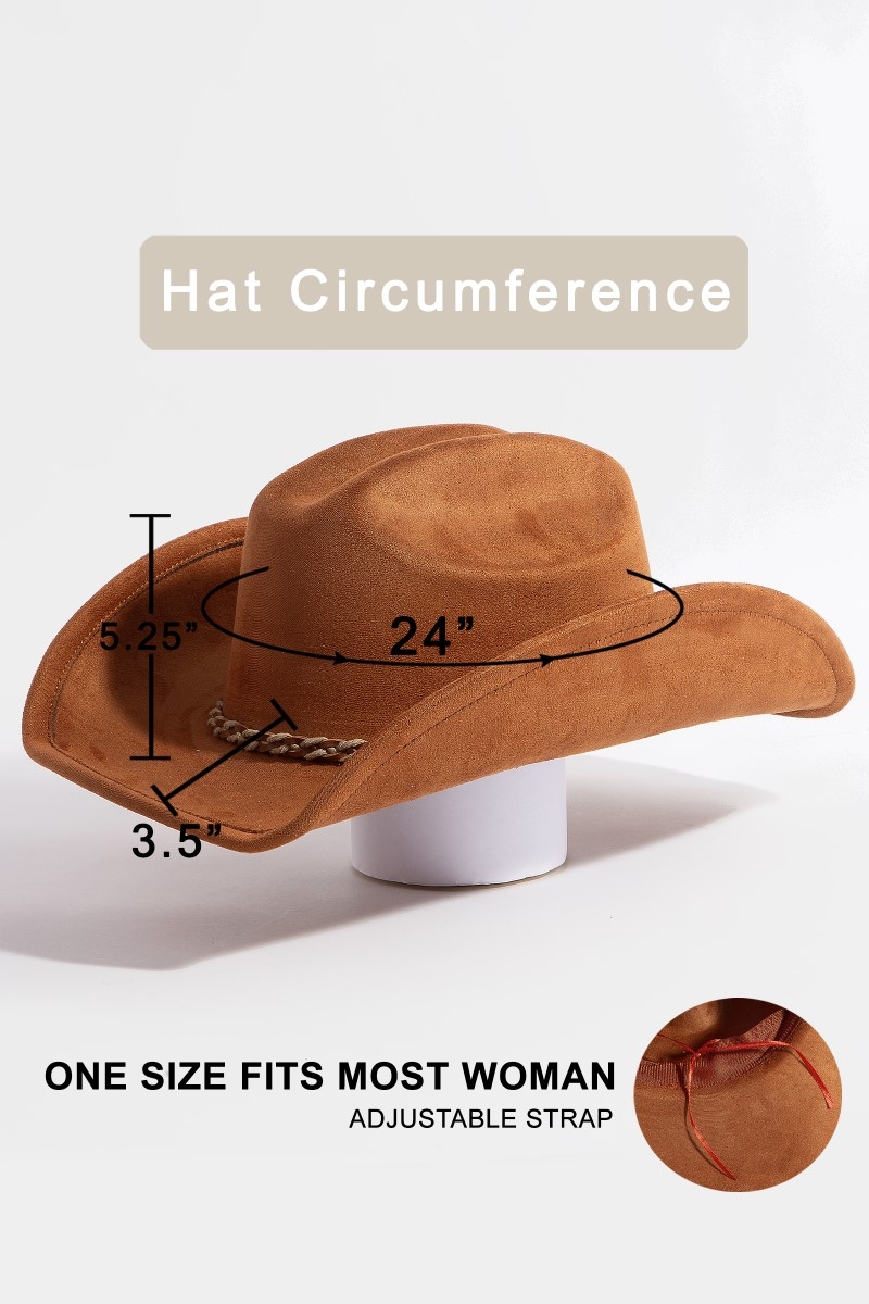 Effortlessly elevate your outfit, this cowboy hat displays a unique rope band design. Master the art of accessorizing with this versatile cowboy hat, a key element for achieving a chic and polished look. Available in BK, BR, DBR, IV. This item is sold in packs of 1.