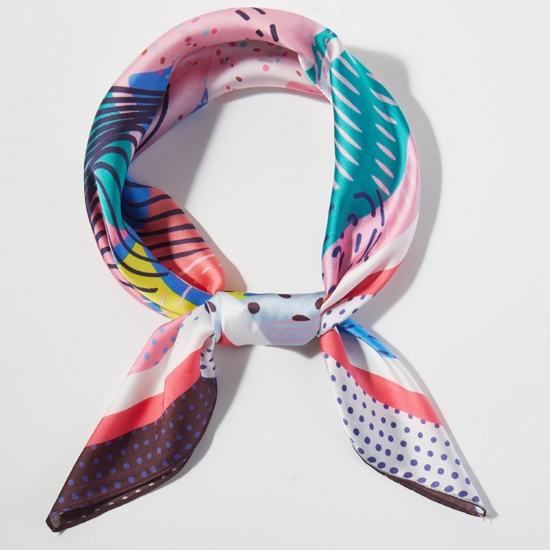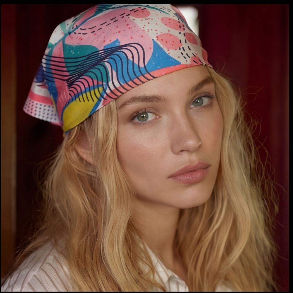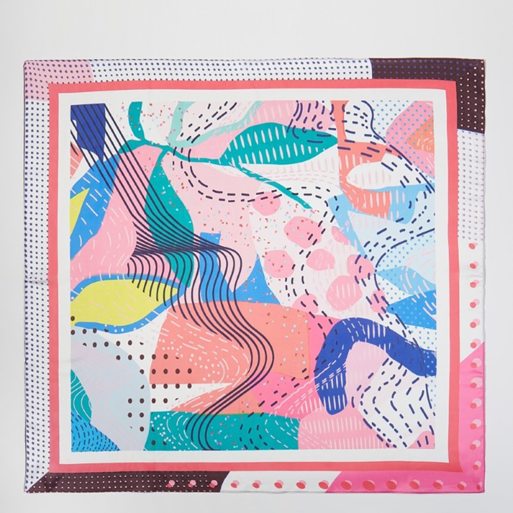 • This piece is designed to make a statement, this scarf flaunts a luxurious abstract collage print square bandana design. Unleash the charm of this versatile scarf, effortlessly turning any outfit into a fashion statement. Available in BL, GN, PK. This item is sold in packs of 1.
