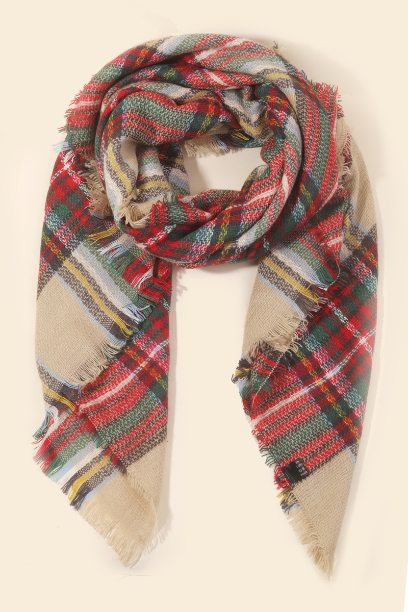 - A modern classic, this oblong scarf flaunts a luxurious beige plaid oblong scarf design. A must-have accessory that adds a unique flair to any look. This item is sold in packs of 1.