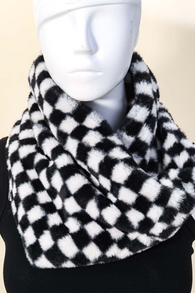 Perfect for any occasion, this infinity scarf encompasses a grand fuzzy checkered fashion design. Embrace fashion flexibility with this versatile infinity scarf, designed to effortlessly enhance the sophistication of any outfit. Available in BR, BW, OL. This item is sold in packs of 1.