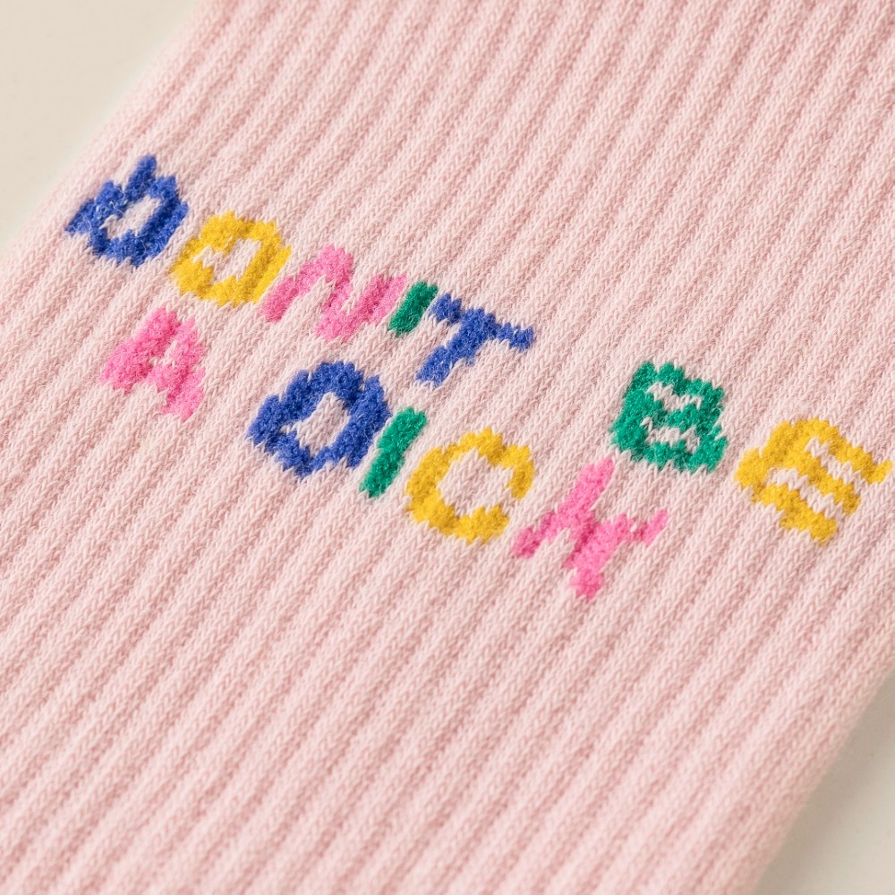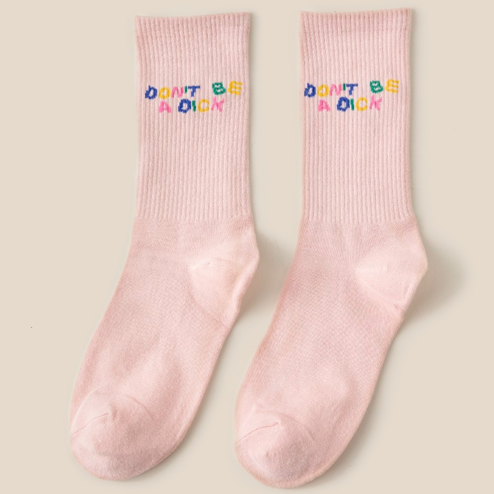 - This piece is perfect for those who want to showcase their unique style, this pair of socks showcases a breathtaking don't be a dick pink long socks design. Elevate your outfit with this stylish pair of socks that's perfect for any occasion. Available in PK. This item is sold in packs of 1.