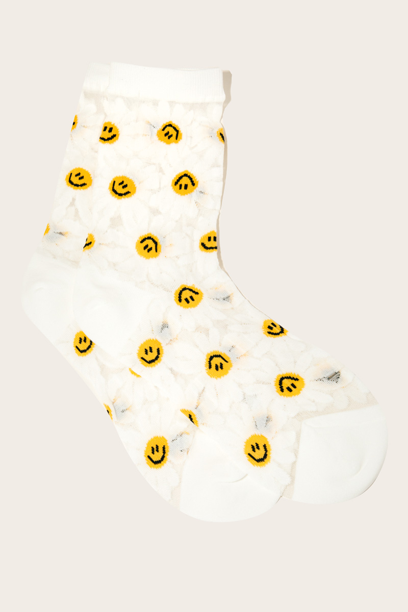 The perfect way to add some edge to your look, this accessory flaunts a luxurious see through daisy smiley face socks design. A stylish accessory that's perfect for complementing your favorite outfit. This item is sold in packs of 1.
