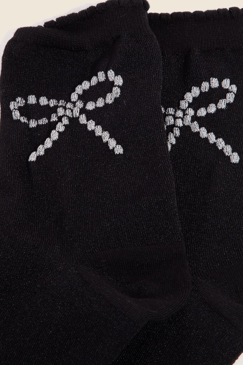 Long Silver Glitter Ribbon Bow Embroidered Black Socks