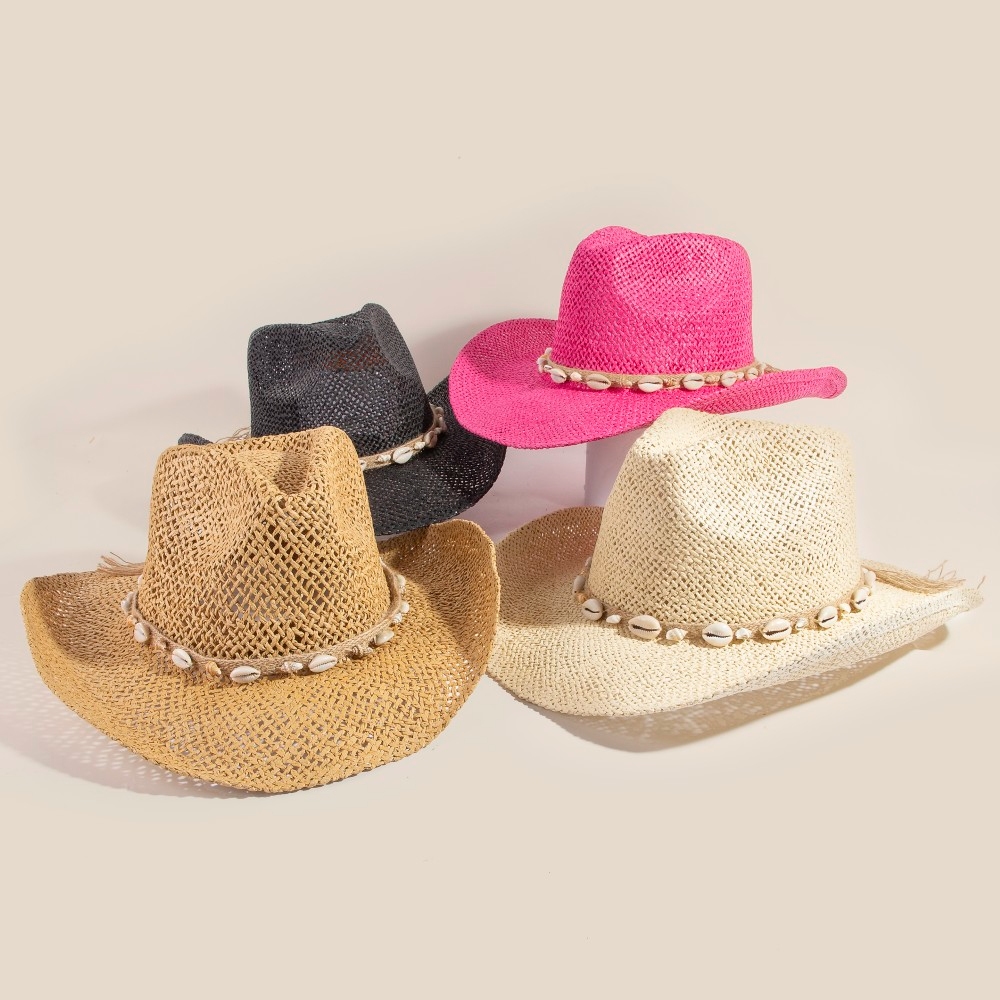 A modern classic, this cowboy hat includes a stunning straw weave cowrie shell rope strap design. Unleash the power of style with this versatile cowboy hat, perfect for enhancing the charm of your wardrobe. Available in FU, GN, IV, BK and KA. This item is sold in packs of 1.