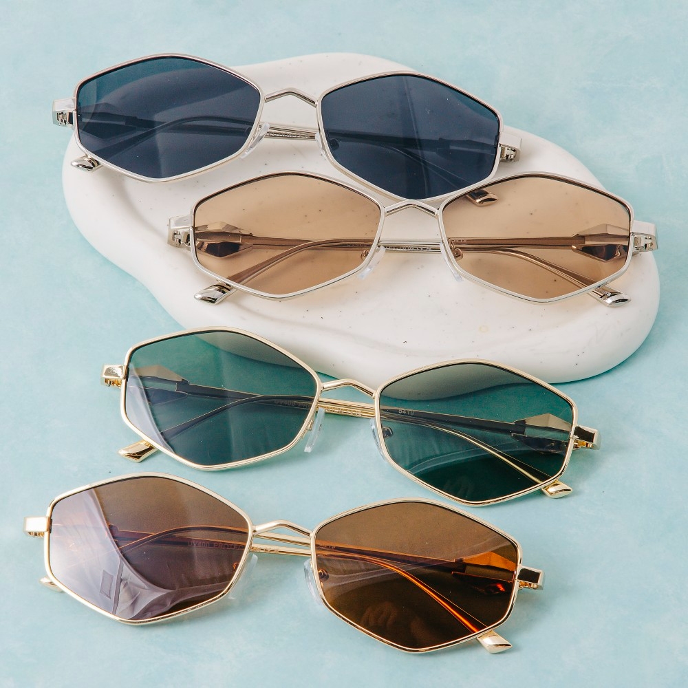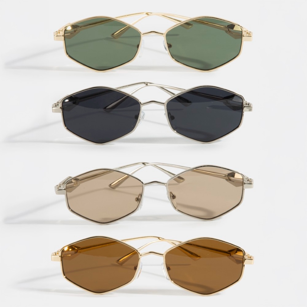 This season's hottest set of sunglasses, this set of sunglasses highlights a special geometric hexagonal metal frame sunglasses set design. This versatile set of sunglasses adds a touch of elegance to any outfit. This item is sold in packs of 12.