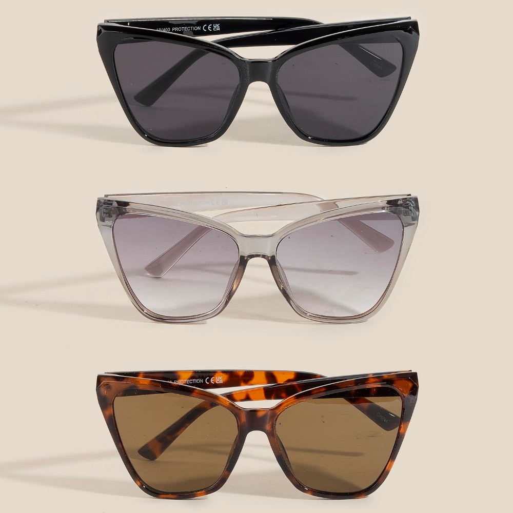 Chic, sophisticated, and always in style, this set of sunglasses features a distinct large cat eye sunglasses set design. Perfect for adding a pop of color or texture to any outfit, this set of sunglasses is a must-have. This item is sold in packs of 12.