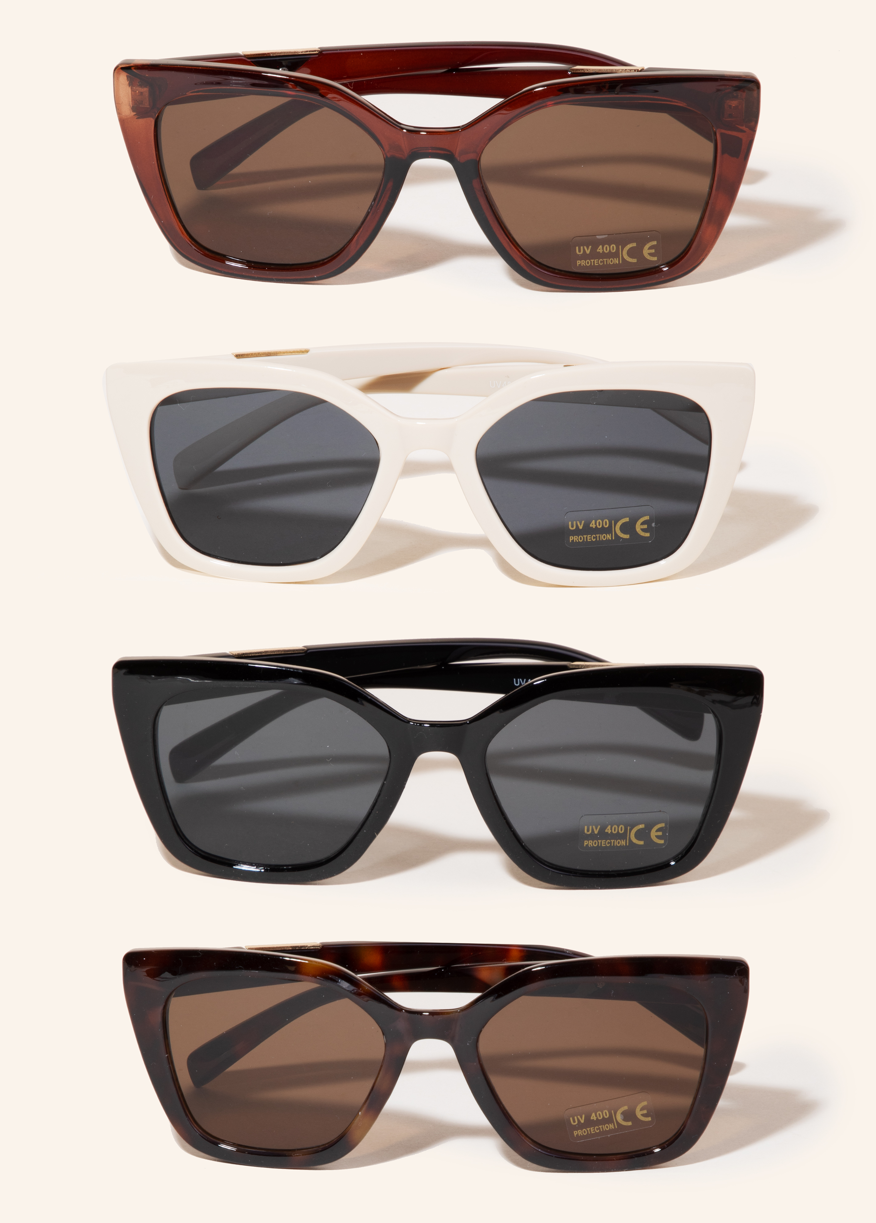 Upgrade your set of sunglasses game, this set of sunglasses showcases a breathtaking metallic accent cat eye sunglasses design. It also includes a uv 400 protection. This item is ideal for those who want to add some personality to their outfits without being too bold. Available in Assorted. This item is sold in packs of 12.