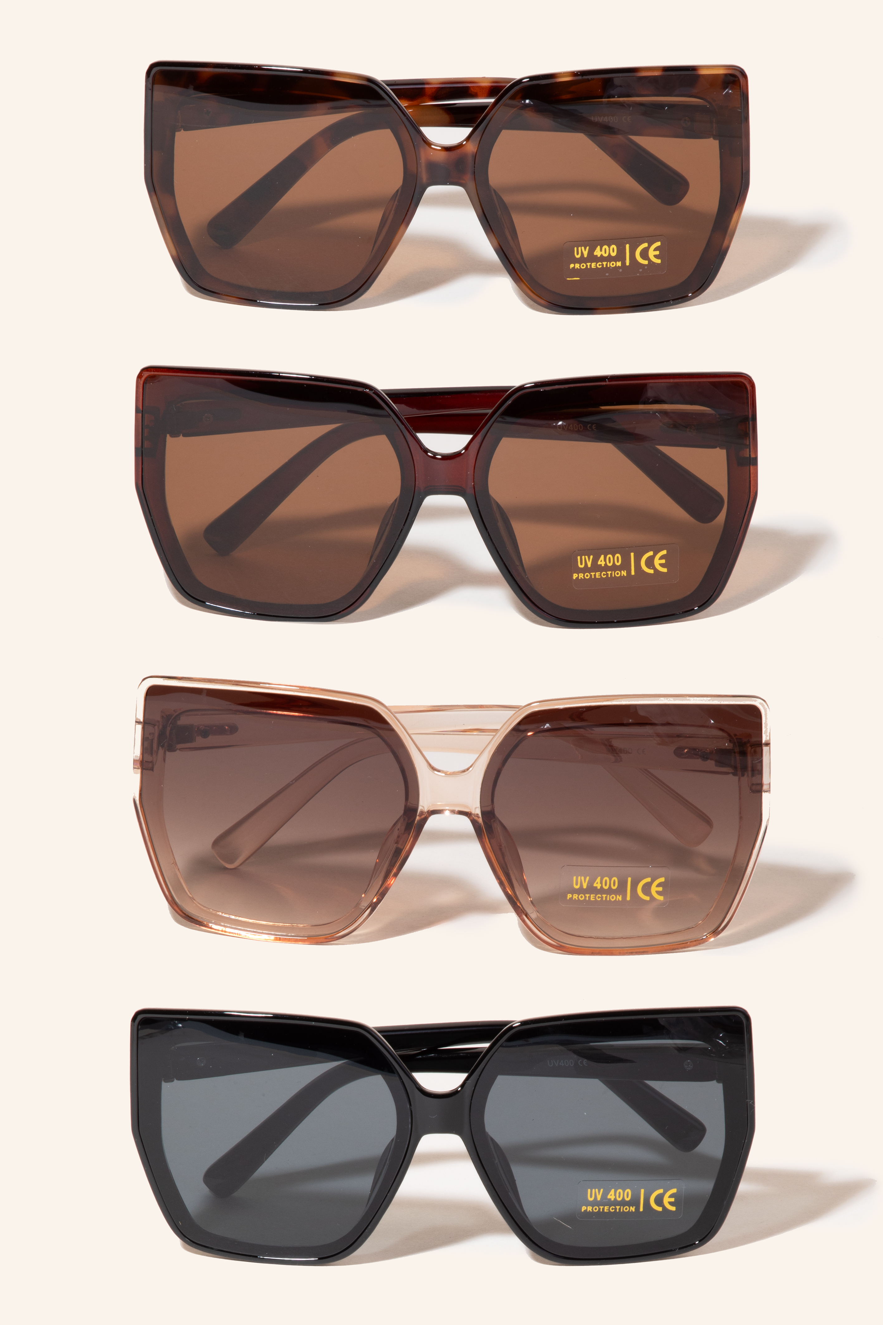 An instant wardrobe staple, this set of sunglasses offers a remarkable metallic accent large square sunglasses design. It also includes a uv 400 protection. Unleash the charm of this versatile set of sunglasses, effortlessly turning any outfit into a fashion statement. Available in Assorted. This item is sold in packs of 12.