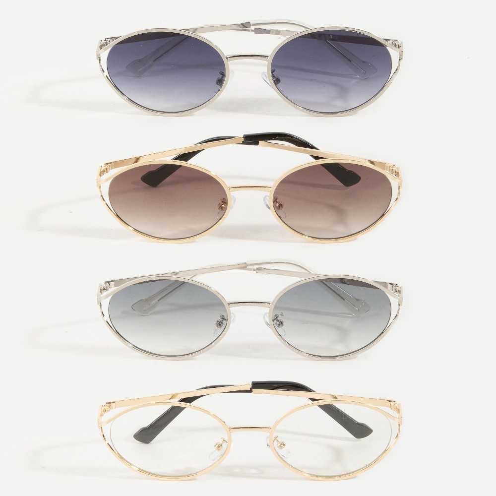 - A bold and daring choice that is sure to impress, this set of sunglasses incorporates a remarkable oval lens metal frame sunglasses set design. Elevate your everyday style with this versatile set of sunglasses, a simple yet impactful addition to your fashion repertoire. This item is sold in packs of 12.