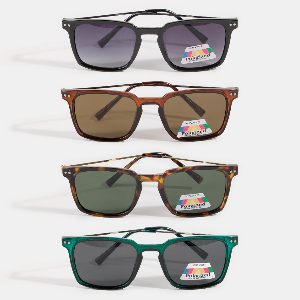 Unleash your inner fashionista, this set of sunglasses reveals an intricate polarized square double bridge flat top sunglasses design. Discover a new level of fashion versatility as this set of sunglasses effortlessly elevates the allure of your attire. Available in ASSORTED. This item is sold in packs of 12.