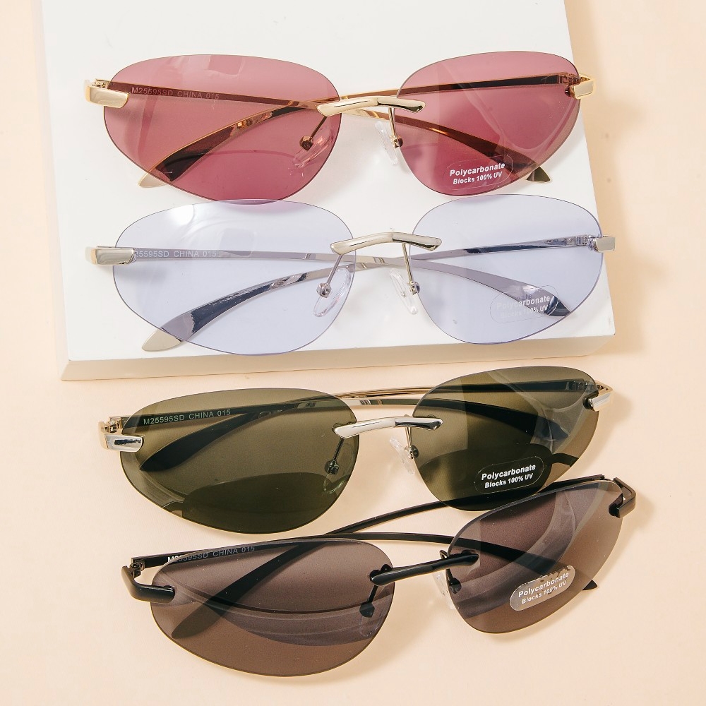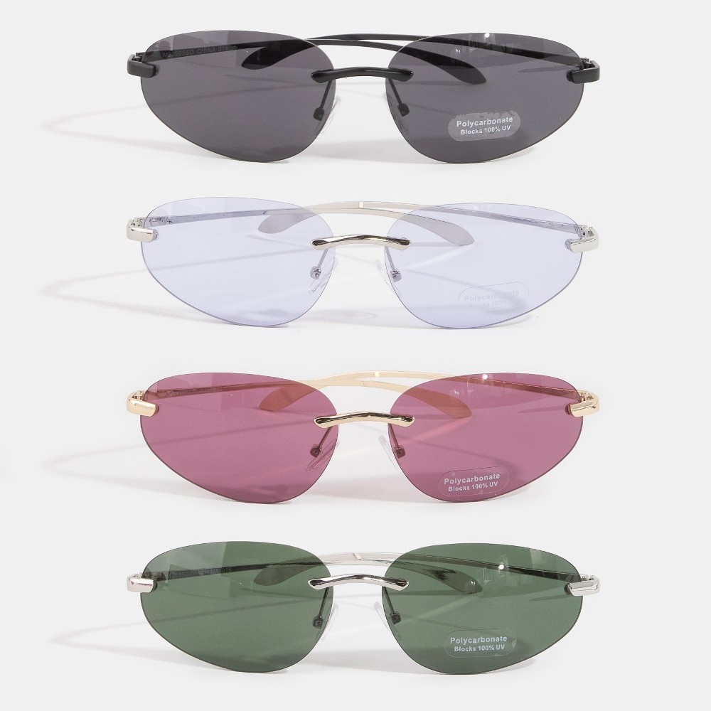 Add some edge to your wardrobe, this set of sunglasses reveals an intricate rimless oval sunglasses with double bridge design. Redefine your wardrobe with this versatile set of sunglasses, a timeless addition that brings an air of sophistication to any look. This item is sold in packs of 12.