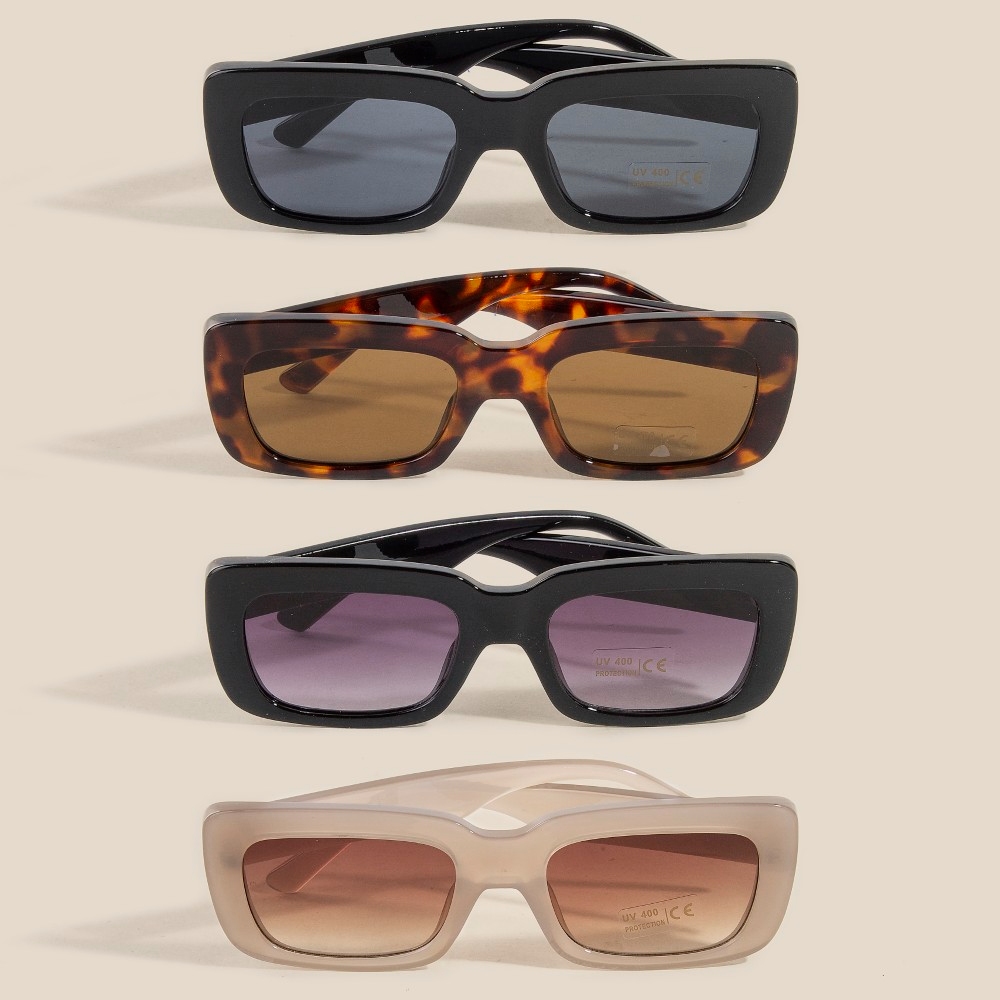 - Make a statement, this set of sunglasses exudes a refined thick plastic frame rectangle sunglasses design. Elevate your fashion statement with this versatile set of sunglasses, adding a touch of glamour to your everyday look. Available in NO COLOR. This item is sold in packs of 12.