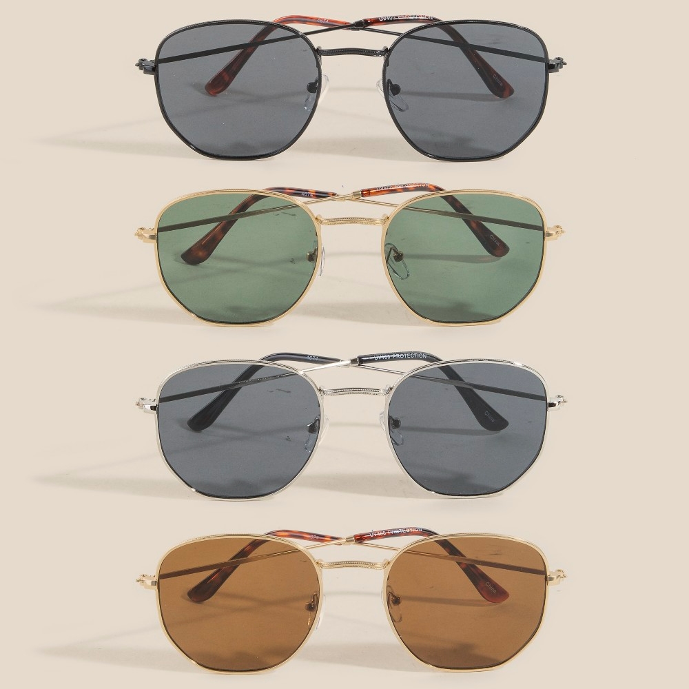 • A classic design with a contemporary twist, this set of sunglasses brings a one-of-a-kind twelve piece thin metallic frame fashion sunglasses design. This set of sunglasses is the perfect way to add a touch of elegance to any outfit. Available in NO COLOR. This item is sold in packs of 12.