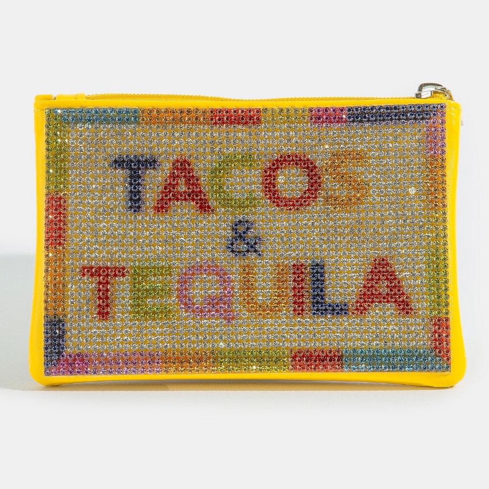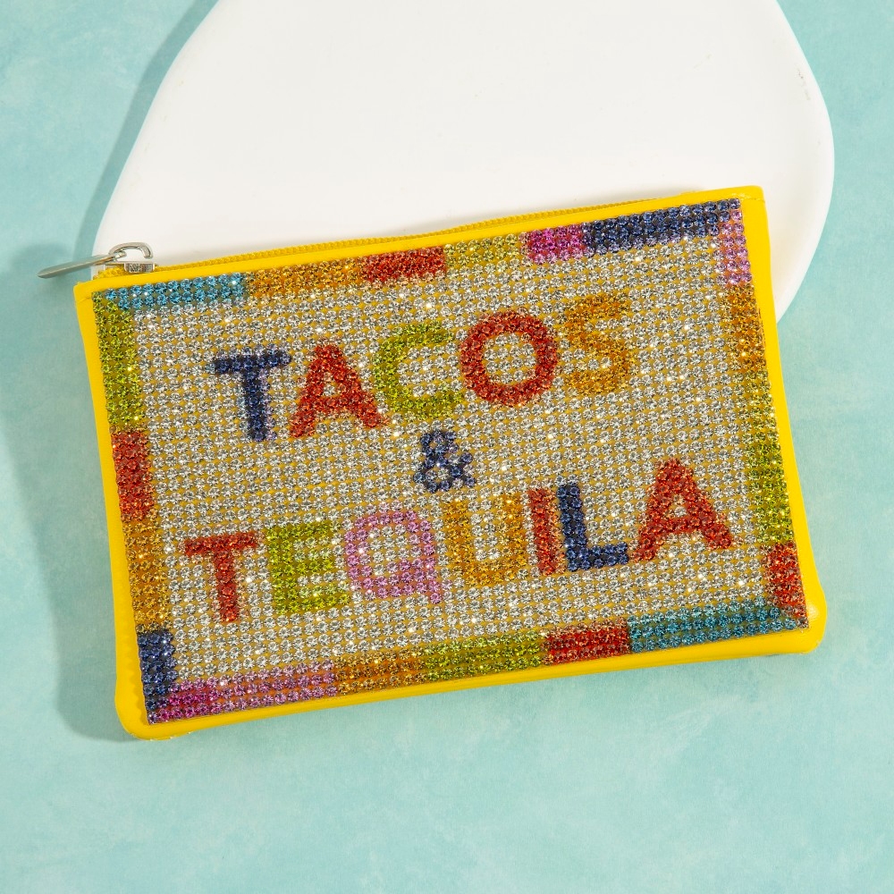 A modern classic, this coin purse includes a stunning tacos and tequila pave design. Perfect for dressing up your favorite outfit, this coin purse is a must-have. This item is sold in packs of 1.