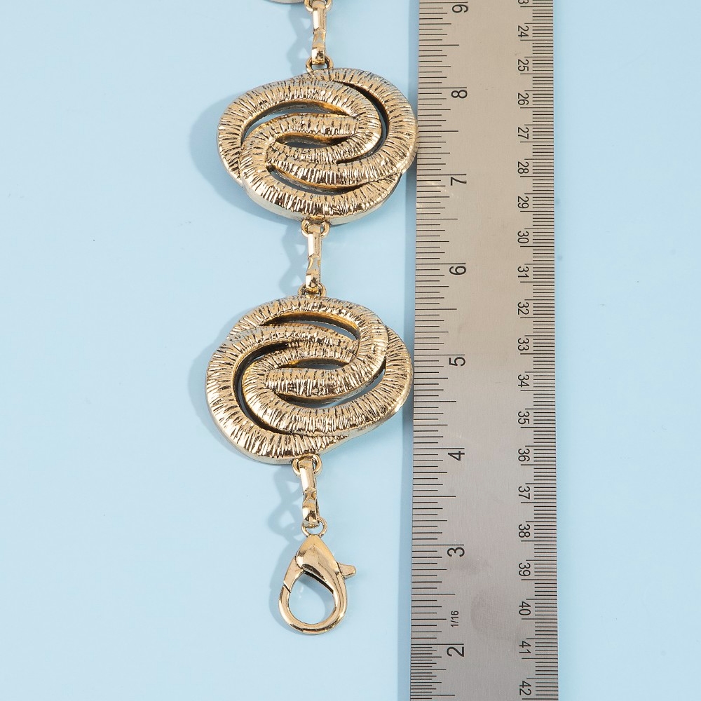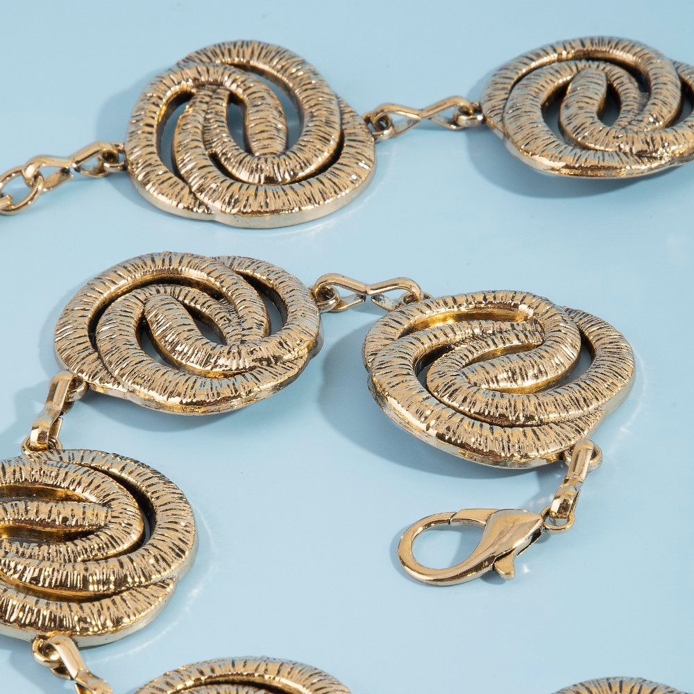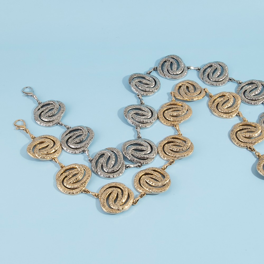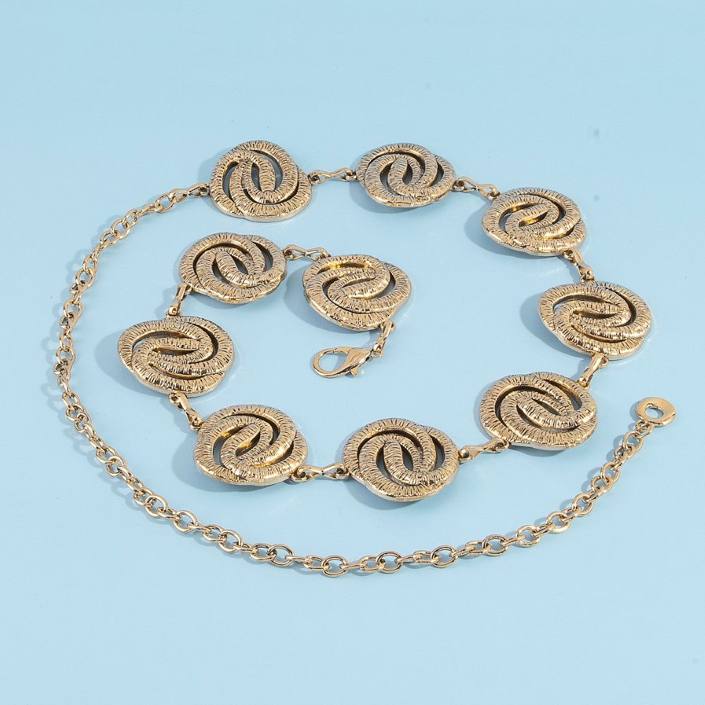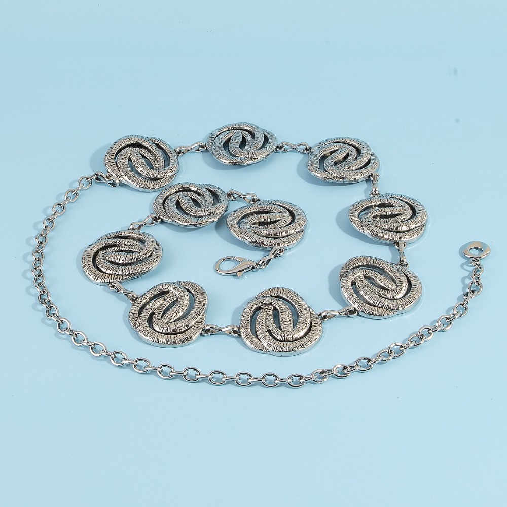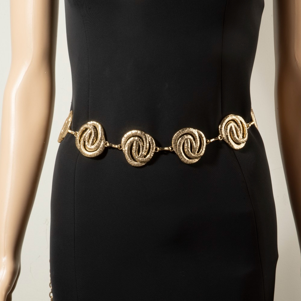 • Guaranteed to add a touch of glamour to any outfit, this chain belt exudes a refined textured spiral concho design. Elevate your fashion statement with this versatile chain belt, adding a touch of glamour to your everyday look. Available in G, S. This item is sold in packs of 1.