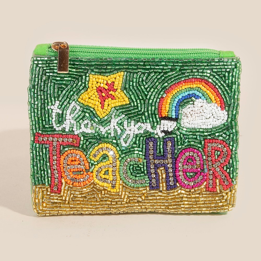 - The perfect way to complete any outfit, this coin purse radiates a sleek thank you teacher rainbow seed beaded design. The perfect way to elevate any outfit, this coin purse adds a touch of elegance and style. Available in MULTI. This item is sold in packs of 2.