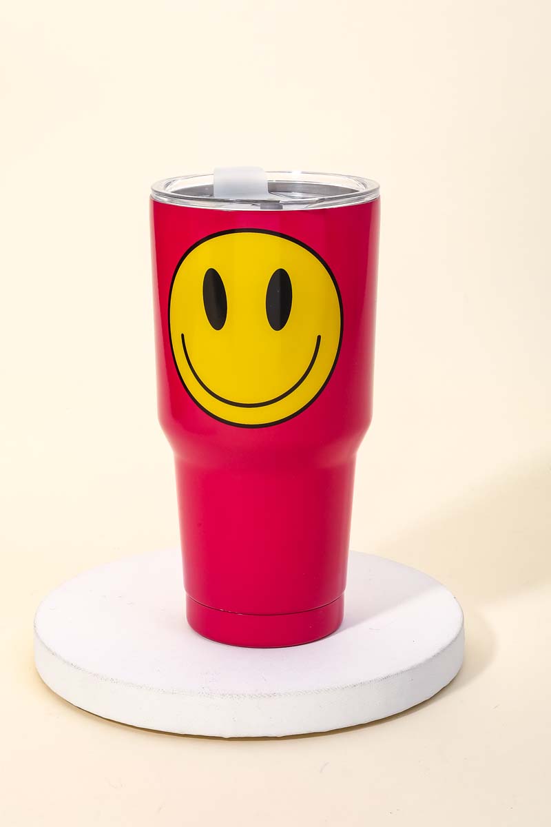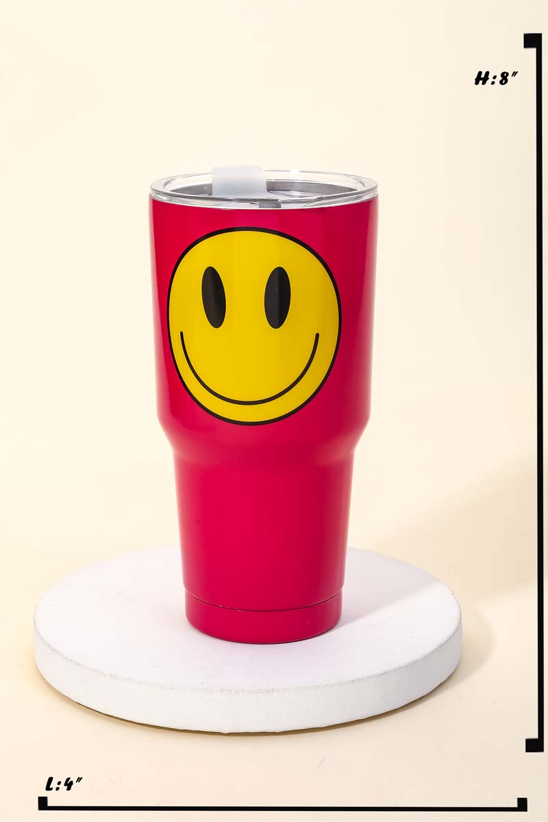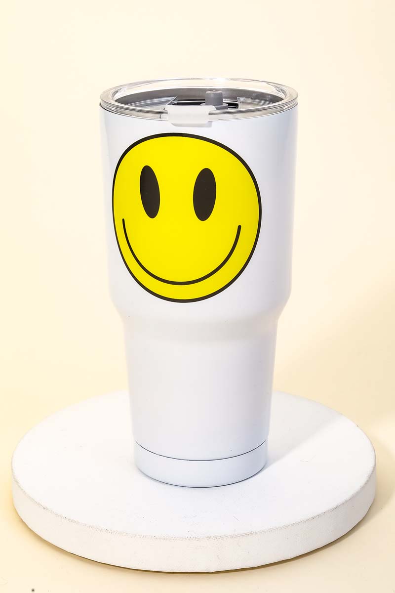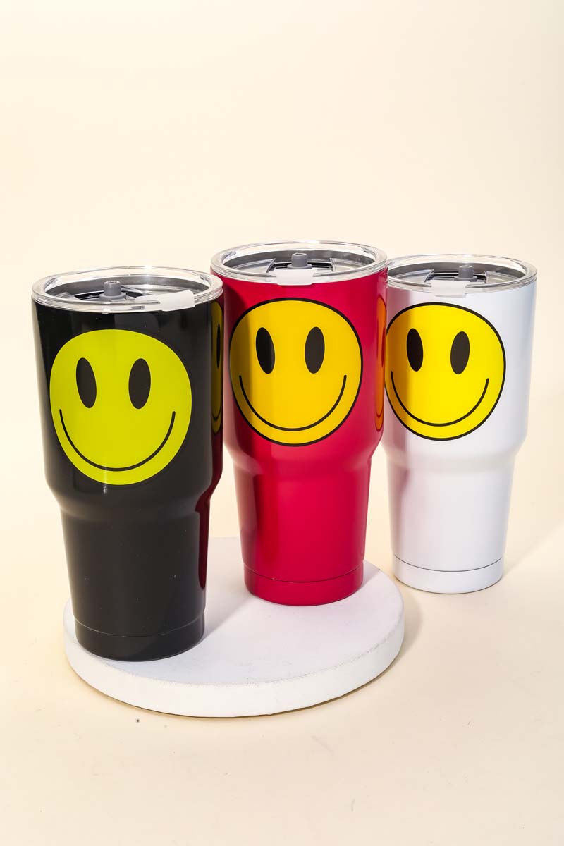This new popular trending Tumblr has a unique glossy yellow smiley face tumbler design. Perfect for all occasions! Available in BK, PK and WH.