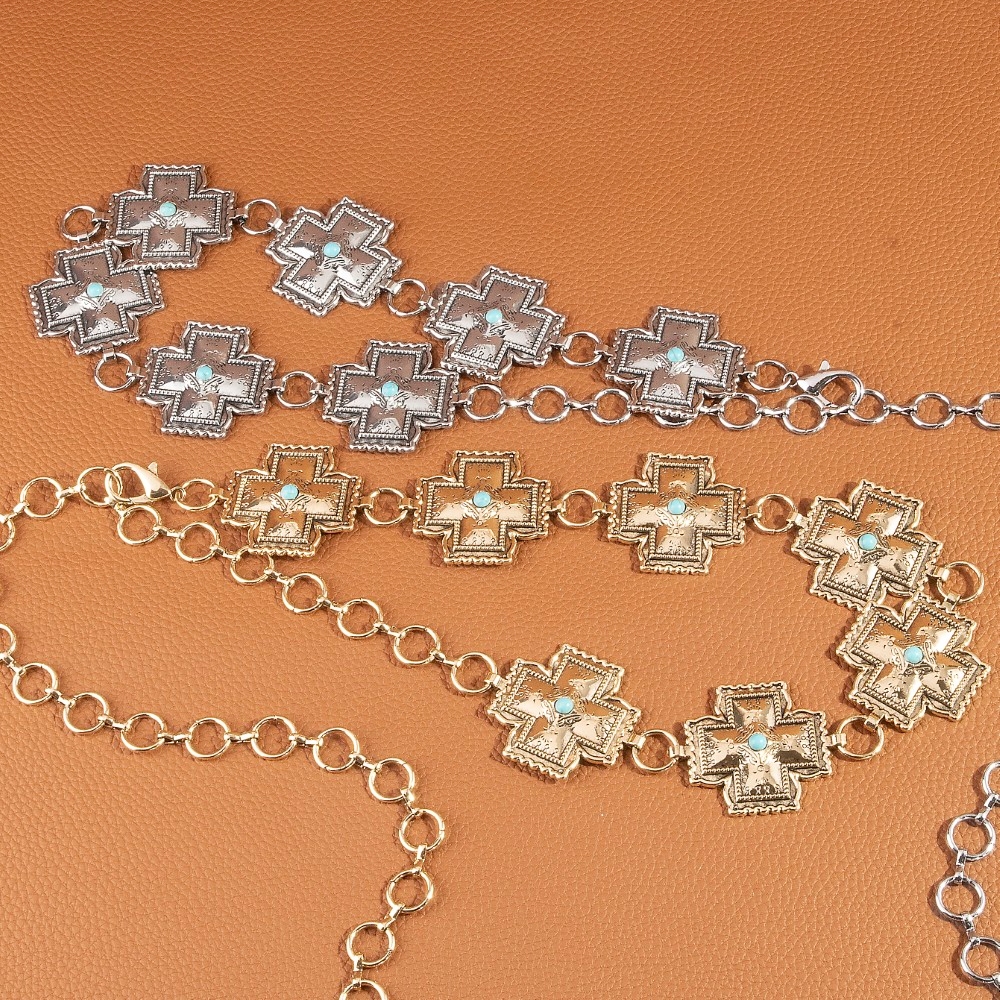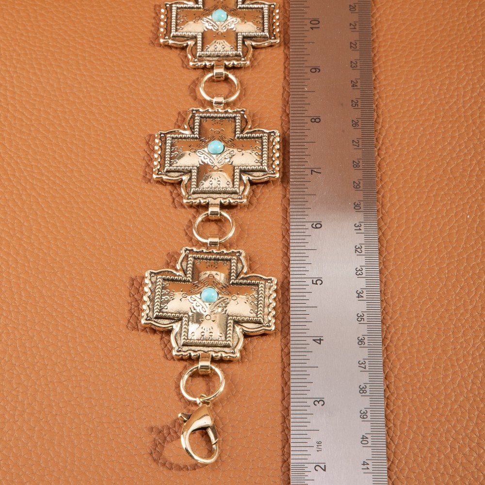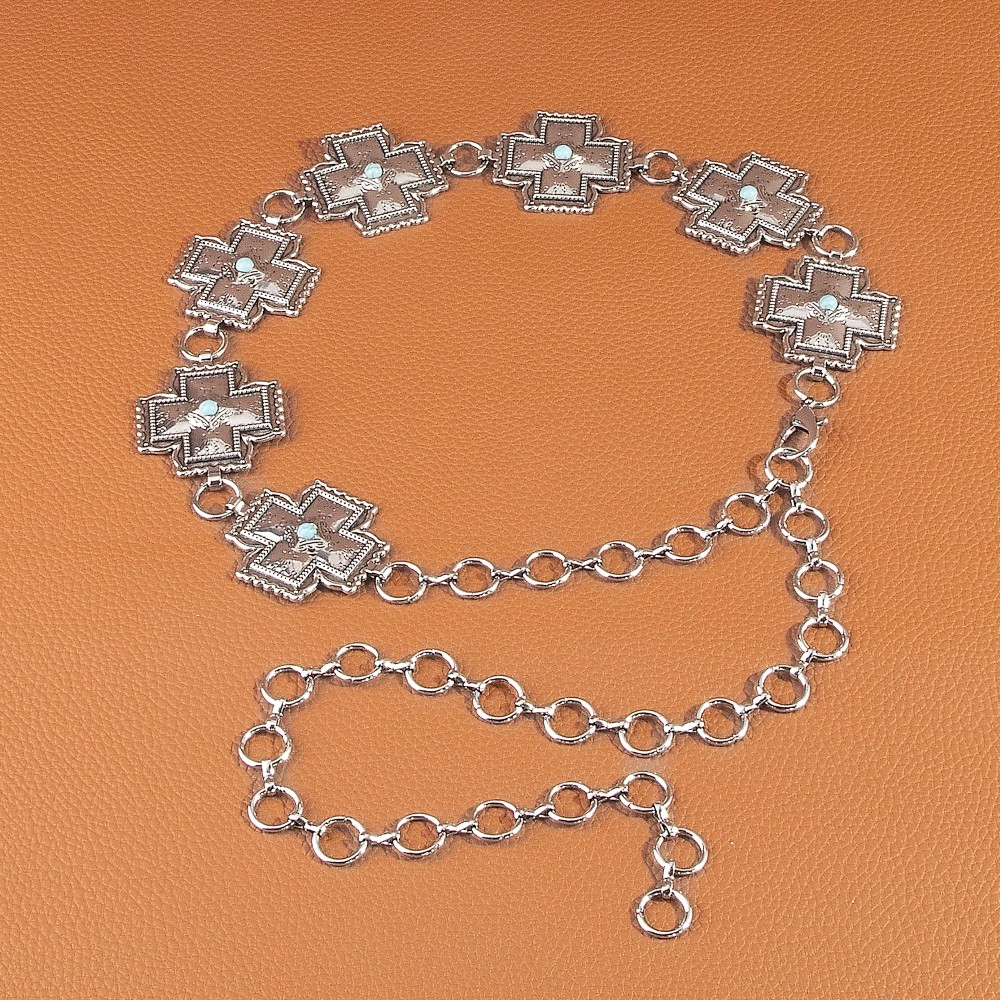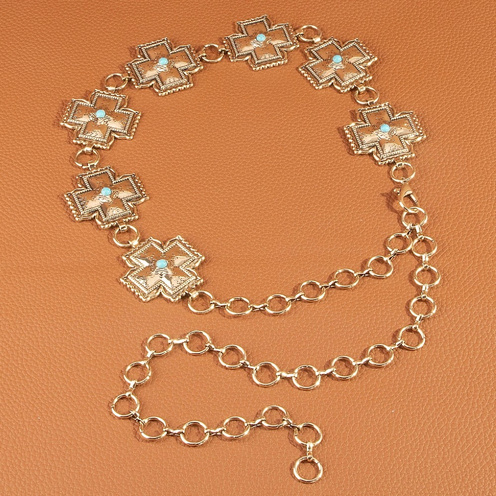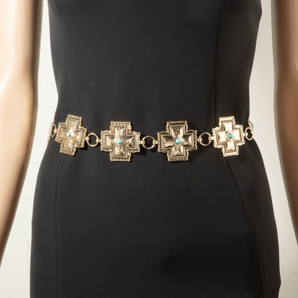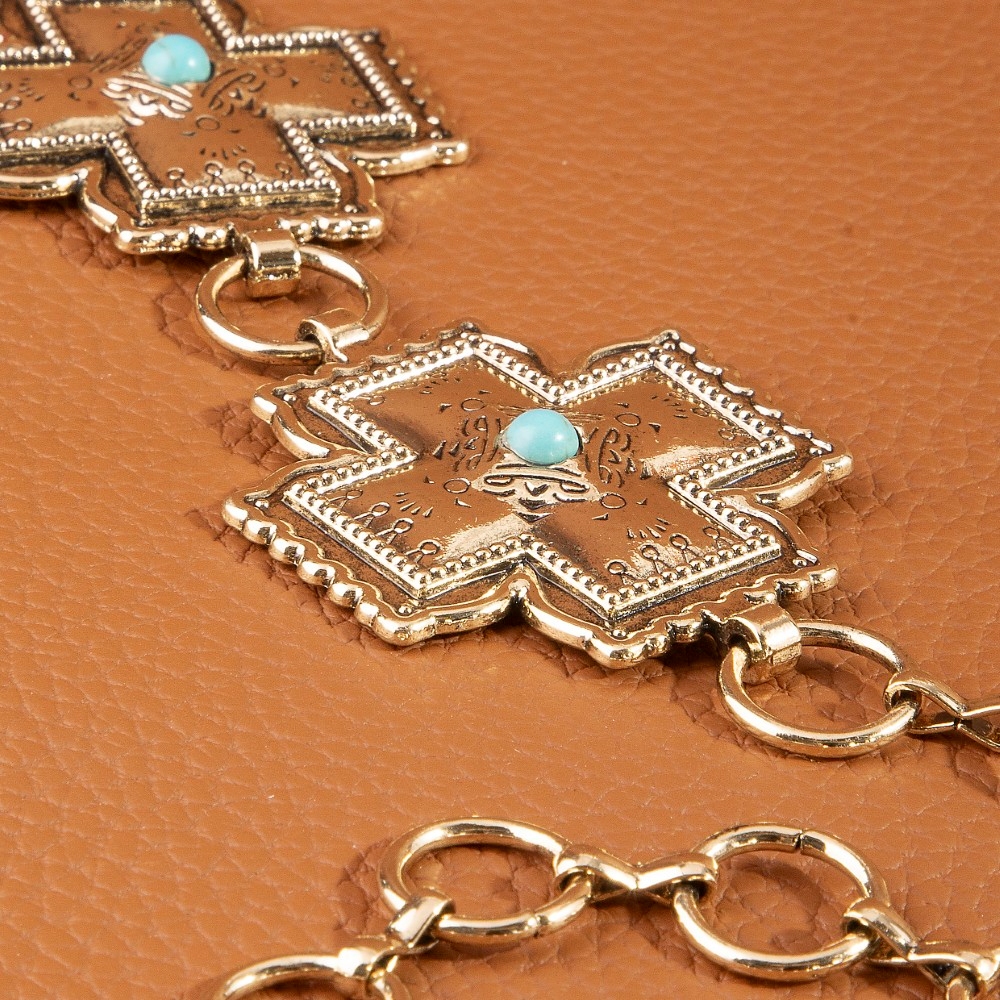 • This piece is both timeless and on-trend, this chain belt emanates an elegant turquoise cross concho design. A must-have chain belt that adds a unique flair to any look. Available in G, S. This item is sold in packs of 1.