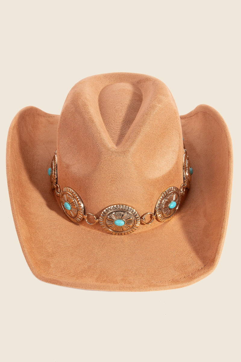 The perfect way to showcase your unique style, this cowboy hat incorporates a flawless turquoise stud oval concho chain design. Unleash the potential of your wardrobe with this versatile cowboy hat, ensuring a touch of elegance in every ensemble. Available in BK, BR, GR, IV, RU. This item is sold in packs of 1.