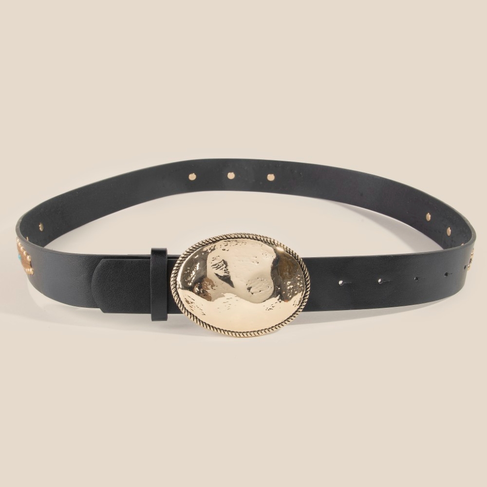 Perfectly versatile and endlessly stylish, this faux leather belt comes with a special western style hammered oval buckle design. Redefine your wardrobe with this versatile faux leather belt, a timeless addition that brings an air of sophistication to any look. Available in GBK, GBR, SBK. This item is sold in packs of 1.