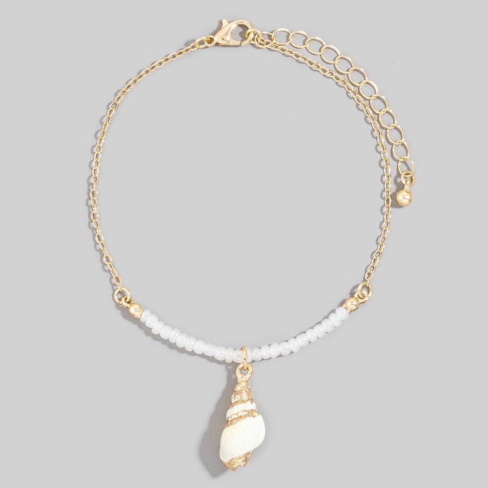 - A timeless piece that will never go out of style, this anklet exudes a refined sea shell charm pearl beaded and chain design. This anklet is a great way to add some flair to your outfit without going over the top. Available in GDCRM. This item is sold in packs of 1.