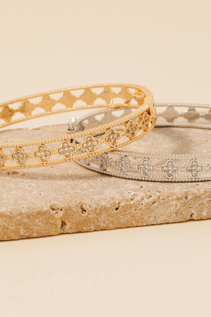Gold Dipped Cz Pave Clover Row Hinge Bangle Bracelet