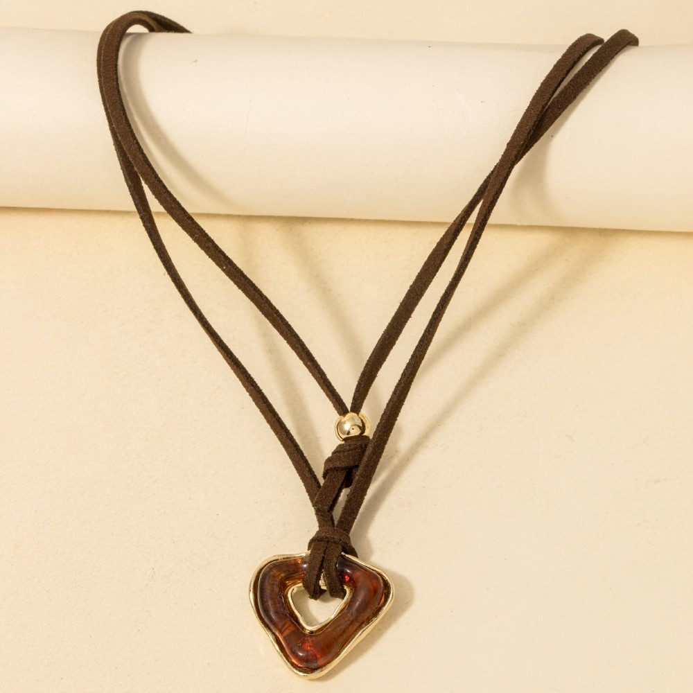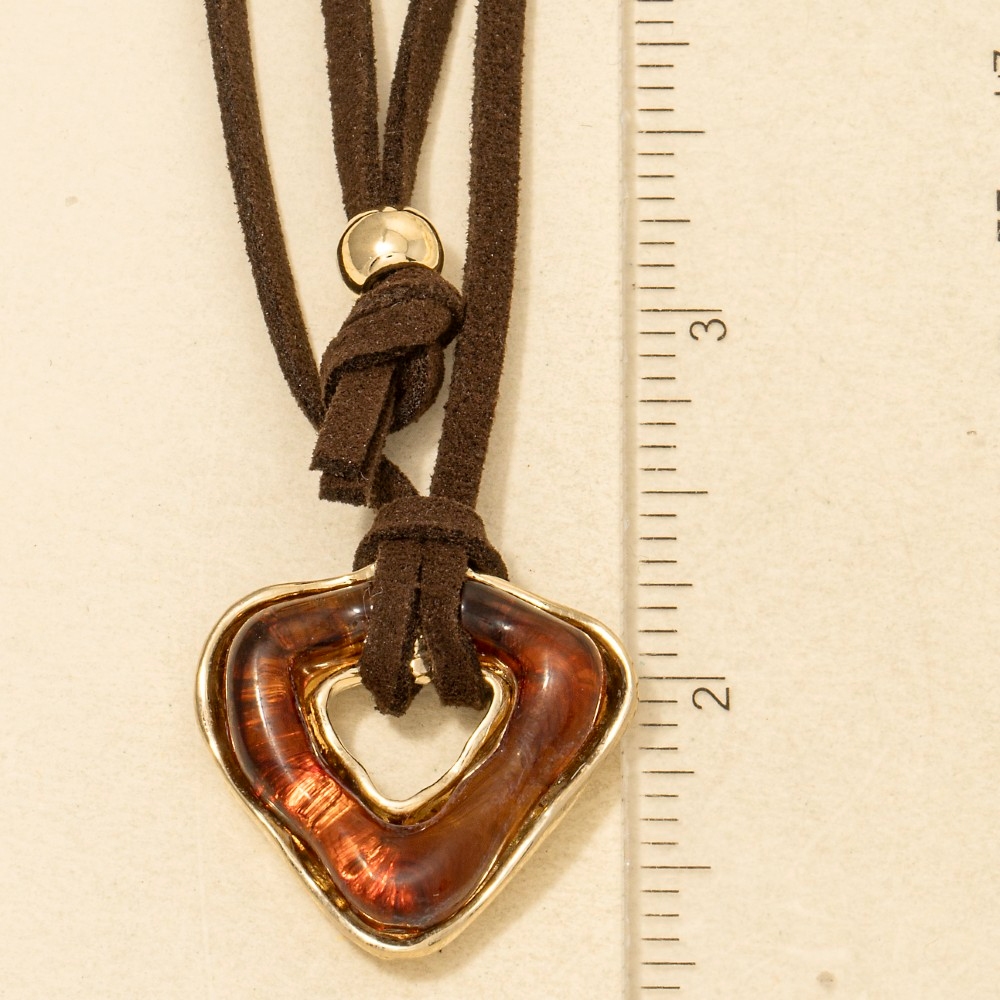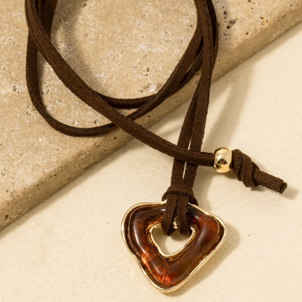 • Make a bold statement, this necklace carries a charming acrylic triangle pendant faux suede cord design. Perfect for adding some texture and dimension to any outfit, this necklace is a must-have. This item is sold in packs of 1.