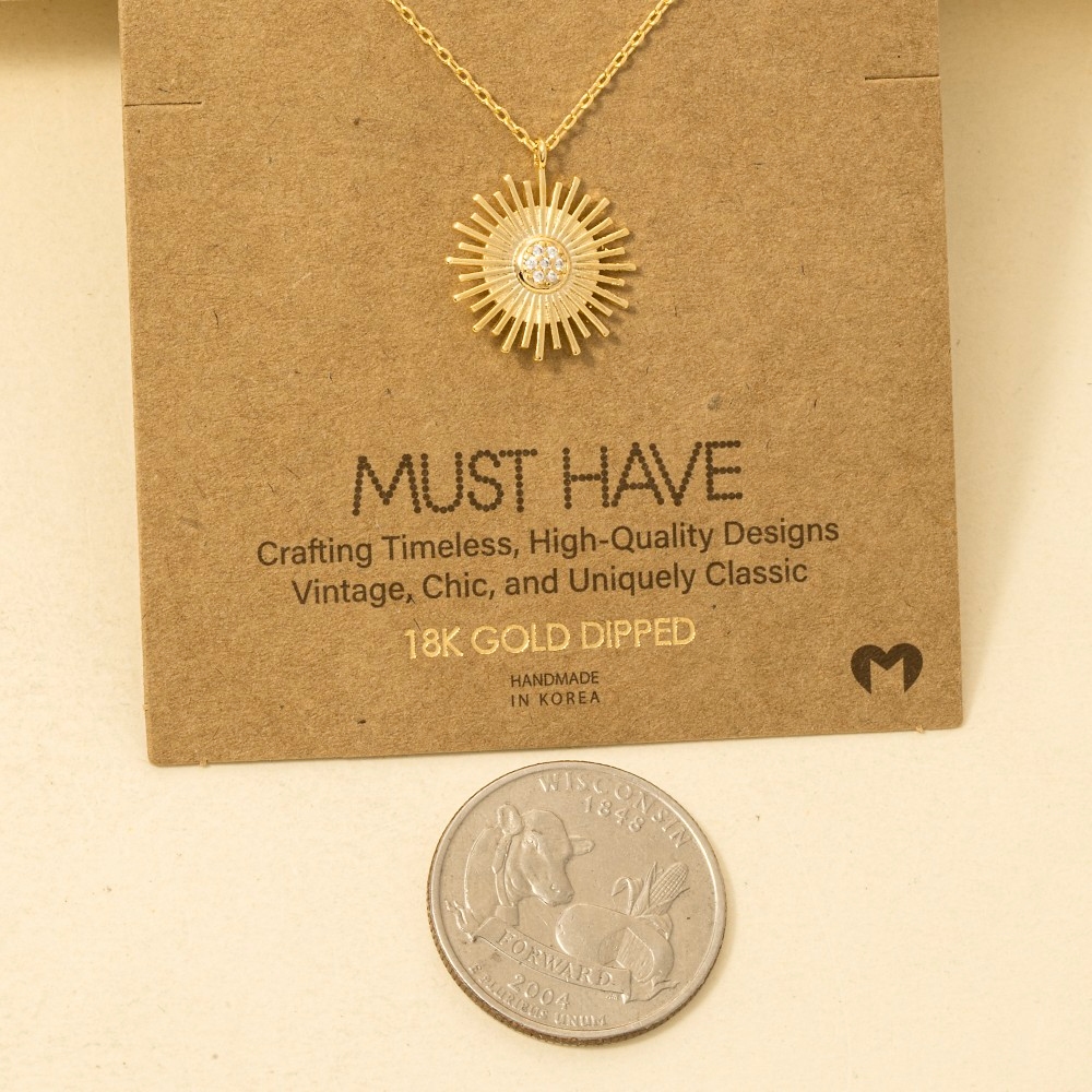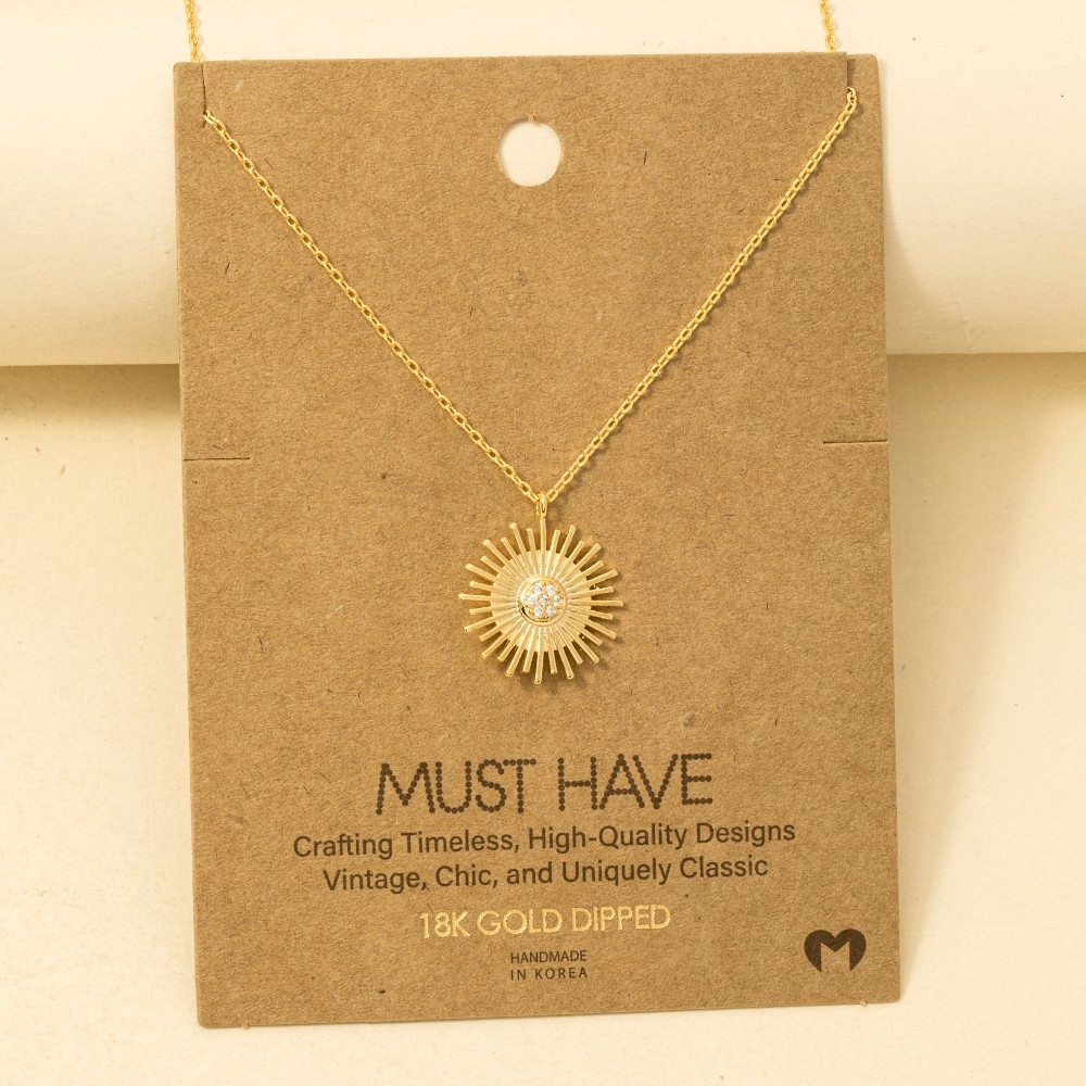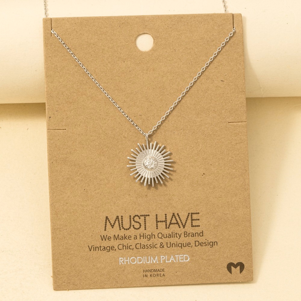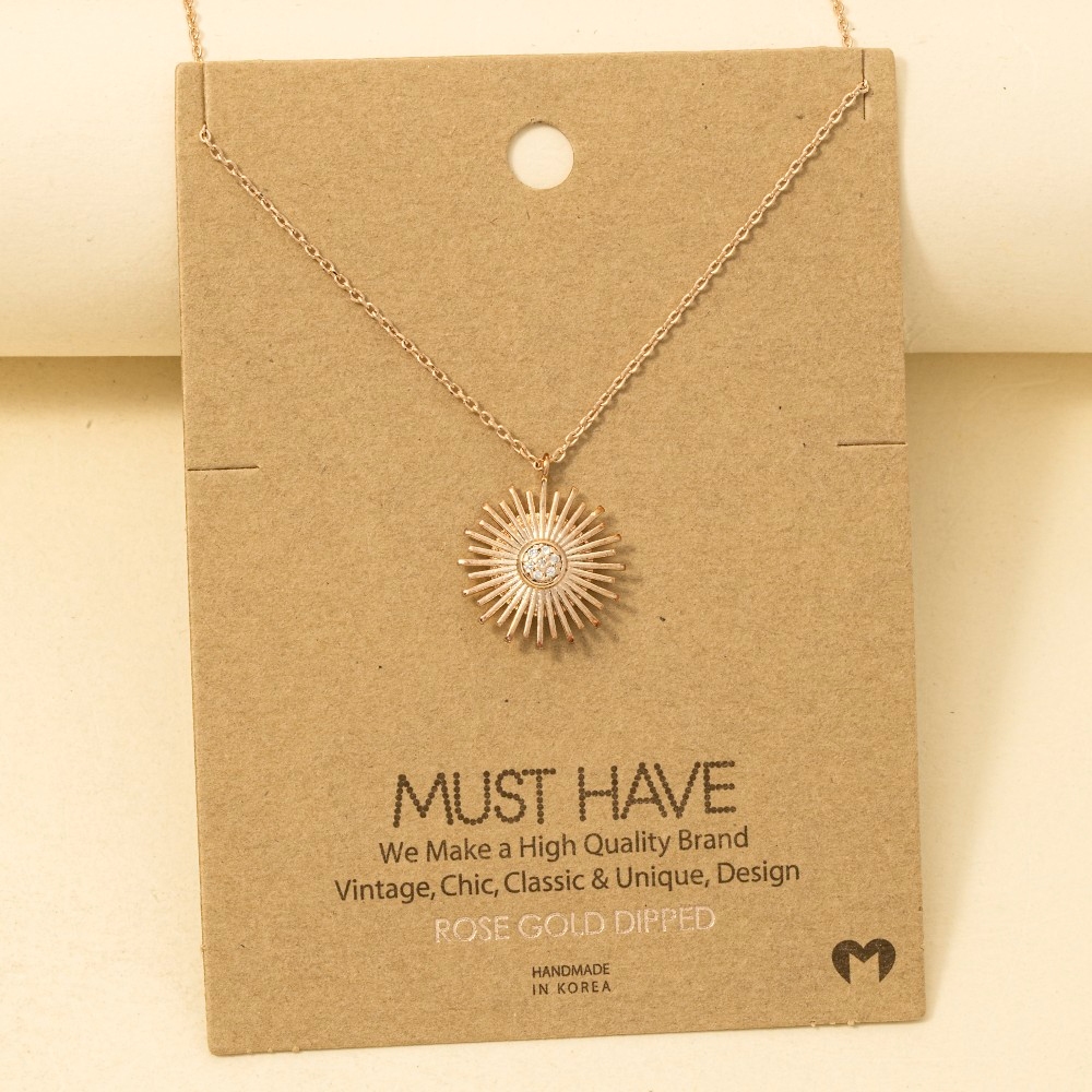 • Elevate any look, this trending necklace highlights a special circle sun shine ray pendant necklace design. Infuse your ensemble with a touch of sophistication using this versatile trending necklace, a game-changer in the world of fashion. Available in G, R, S. This item is sold in packs of 1.